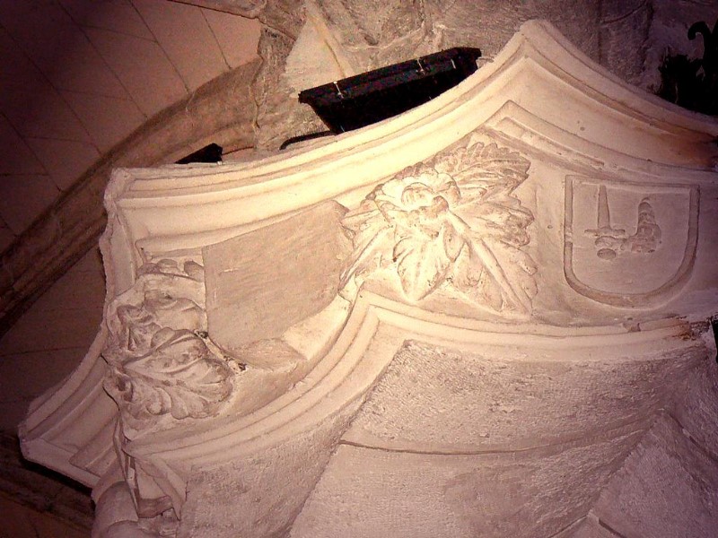 Los escudos, según fuentes documentales, databan del año 1488, durante el reinado de los Reyes Católicos, donde no sólo aparecían emblemas del reinado de Isabel y Fernando sino también de la familia Medina, conocidos por su mecenazgo en la época. Estos símbolos fueron demolidos durante la Guerra Civil. El ayuntamiento de Villena, junto a la Fundación Ruralcaja y la Asociación Amigos de Santiago, ha elaborado un protocolo de actuación para recuperar esos escudos conmemorativos rescatando así una parte importante del patrimonio histórico villenense.