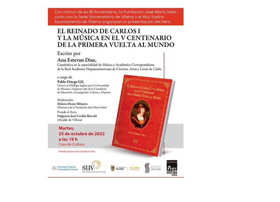 Villena, 24 de octubre de 2022.- La Fundación José María Soler, en colaboración con la Sede Universitaria de la UA, presentará el libro ‘El reinado de Carlos I y la música en el V Centenario de la primera vuelta al mundo’ de la villenense Ana Estevan, catedrática en la especialidad de Música, perteneciente al cuerpo de catedráticos de Secundaria y Bachillerato. Esta actividad conjunta se enmarca en las acciones de conmemoración del 30 aniversario de la Fundación José María Soler, y está prevista para mañana, martes 25 de octubre, a las 19.00 horas en la Casa de la Cultura.