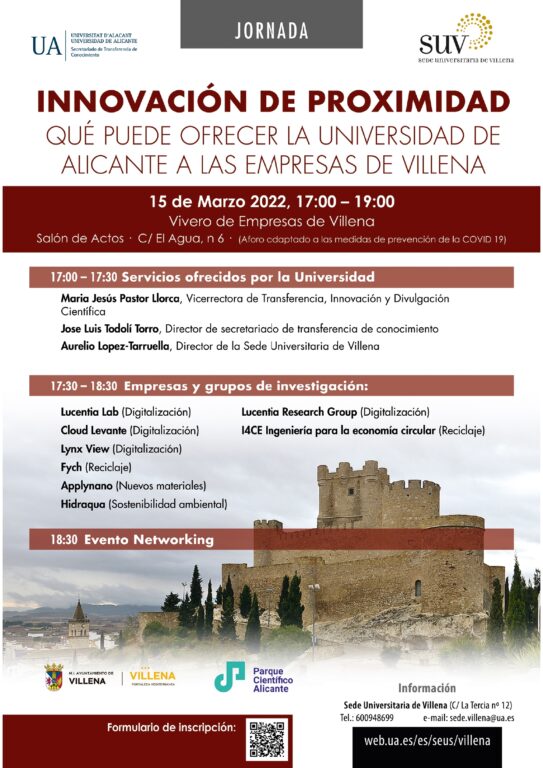 La información sobre la jornada y el formulario de inscripción está disponible en el sitio web de la Sede Universitaria (https://web.ua.es/es/seus/ villena/) o a través del código QR de promoción de la jornada.