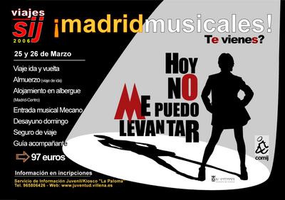 La Concejalía de Juventud del Ayuntamiento de Villena, por iniciativa de la C.O.M.I.J (Coordinadora de Centros de Información Juvenil de la Comarca) y a través del Servicio de Información Juvenil, te da la posibilidad dentro del proyecto de viajes 2006, de disfrutar del montaje más visto en la cartelera madrileña durante el pasado año 2005, y que recoge las culturas de varias generaciones, el musical basado en las canciones de Mecano «Hoy no me puedo levantar».