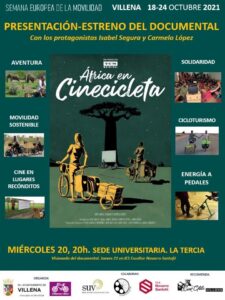 La Semana de la Movilidad 2021 arranca este año con el estreno de este documental en nuestra localidad. Cincecicleta es un proyecto apasionante que une la pasión por la sencillez de la movilidad en bicicleta, con el cine como herramienta para el acercamiento a las comunidades rurales de la cultura, el entretenimiento, la esperanza. Una reflexión sobre la necesidad de volver a la comunidad, a los orígenes. A esos espacios de recreo colectivos. Esos momentos de visualización de un programa en familia. De una actividad comunitaria con el vecindario. Como en los viejos cines de verano. Cinecicleta lleva el cine de pequeño formato a toda la geografía estatal, sobre todo por la España vaciada. Y lo más hermoso, este periplo por algunos países africanos durante más de dos años que recogen en este documento vivencial. Siempre en bicicleta y con su cine ambulante, exhibiendo películas, cortos y documentales.