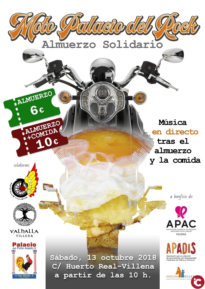 Próximamente los Moter@s y Ciudadanos tenemos una cita Solidaria en Villena. Con la organización del MotoClub Villena y la colaboración de El Palacio del Pollo y Pub Valhalla, el Sábado 13 de Octubre tendrá lugar el I-MOTO PALACIO DEL ROCK SOLIDARIO, evento consistente en un MotoAlmuerzo-Comida con música en directo a beneficio de APADIS, APAC Y LA SOCIEDAD PROTECTORA DE ANIMALES, tres Asociaciones que trabajan en pro de los Discapacitados Psíquicos, Enfermos de Cáncer y Animales sin hogar respectivamente.
