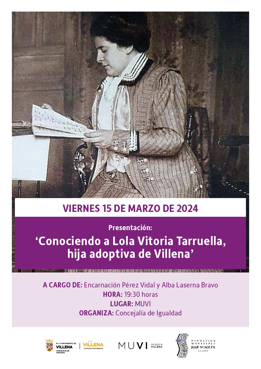 La Concejalía de Igualdad ha organizado la jornada ‘Conociendo a Lola Vitoria Tarruella, hija adoptiva de Villena’ con el objetivo de poner en valor a las mujeres que vivieron en la ciudad y tuvieron un papel determinante en algún aspecto de la vida cultural, social o económica, pero de cuyo legado no consta ninguna referencia en la historia convencional escrita por hombres. La jornada tendrá lugar el próximo viernes, 15 de marzo, a las 19.30 horas en el Museo de Villena (MUVI) a cargo de Encarnación Pérez y Alba Laserna.