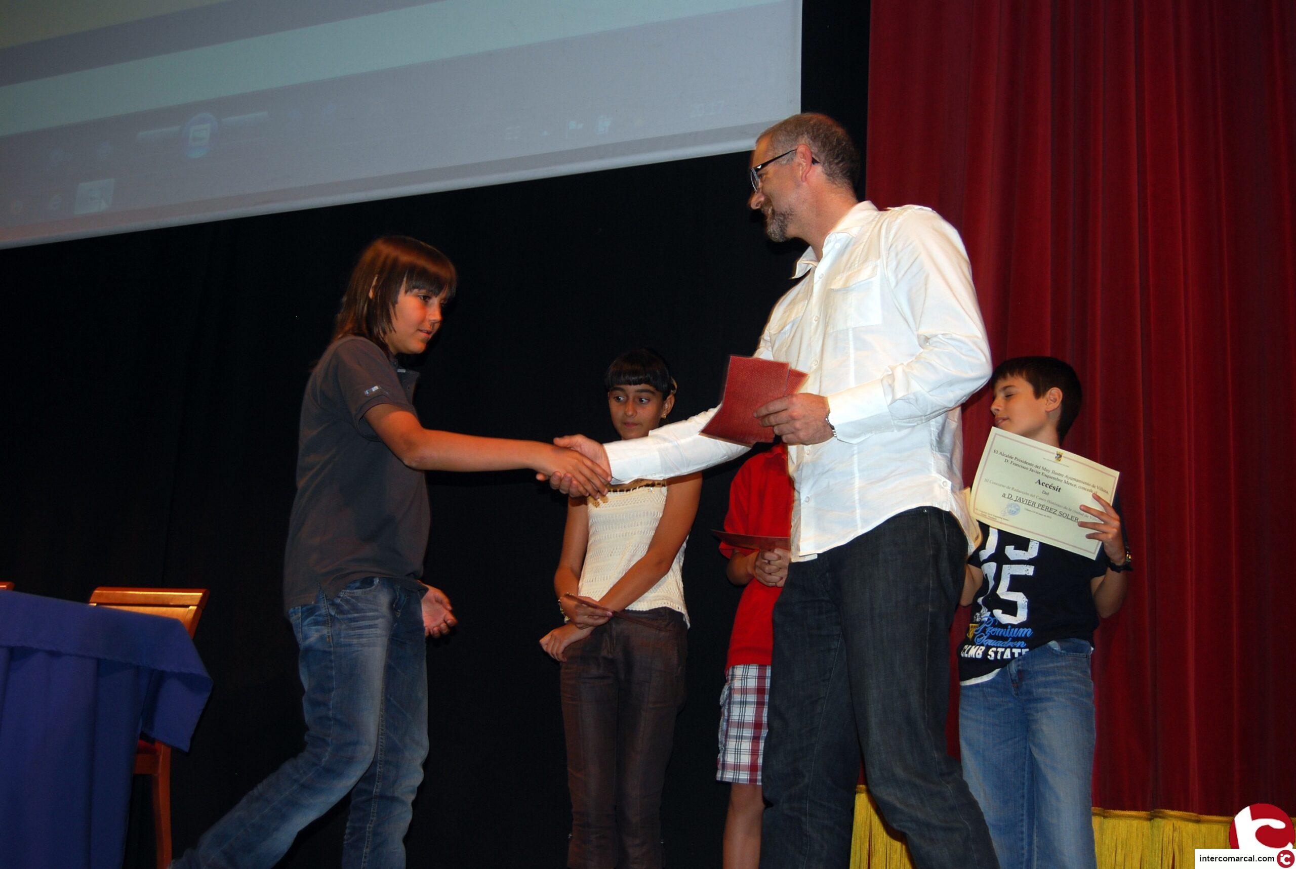 Javier Pérez Soler, alumno del colegio La Celada, fue merecedor de un accésit por su relato titulado «Redacción sobre el casco histórico de Villena». Precisamente la calidad de los escritos ha hecho que en 2012 haya sido necesario otorgar un galardón de estas características por primera vez. Iván Maciá Hernández, del colegio María Auxiliadora, consiguió el tercer premio dotado con un vale regalo de 100 euros por su obra «Una visita por el casco antiguo de Villena». Ariadna M. González Verdú, del colegio La Encarnación, con su relato «Una antigua y preciosa Villena» ha recibido los 150 euros del vale regalo correspondiente al segundo premio. Y «Un habitante extraño», escrito por David Hernández Esquembre, del colegio Ruperto Chapí, ha sido galardonado con el primer premio por un valor de 200 euros.