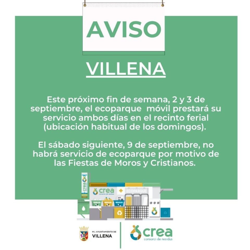 Villena, 30 de agosto de 2023.- La Concejalía de Limpieza y RSU informa de los cambios en ubicaciones y horarios en los próximos días para el servicio de ecoparque móvil de Villena.