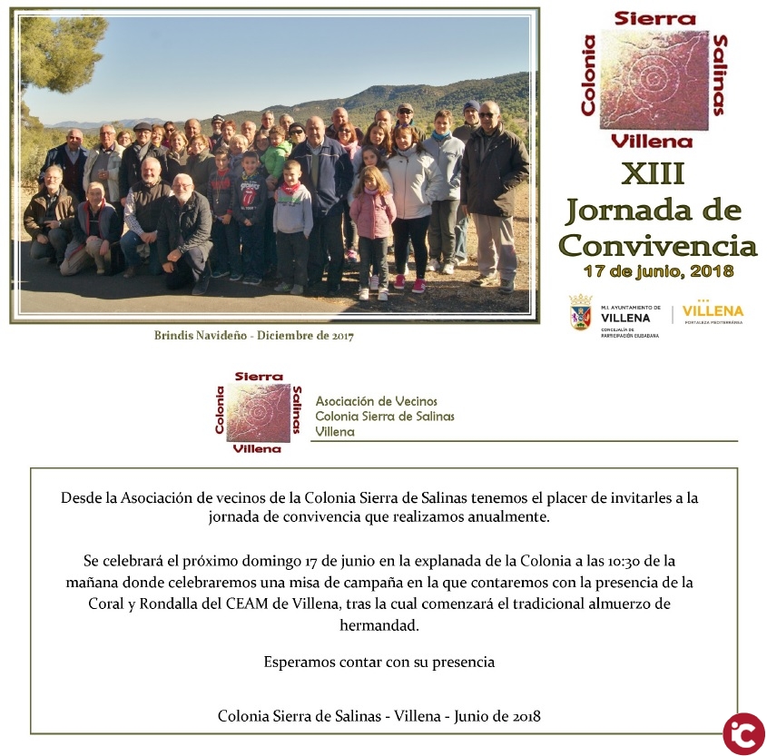 El próximo domingo 17 de junio nos reuniremos en la explanada de la Colonia a las 10:30 de la mañana donde celebraremos una misa de campaña en la que contaremos con la presencia de la Coral y Rondalla del CEAM de Villena, tras la cual comenzará el tradicional almuerzo de hermandad.