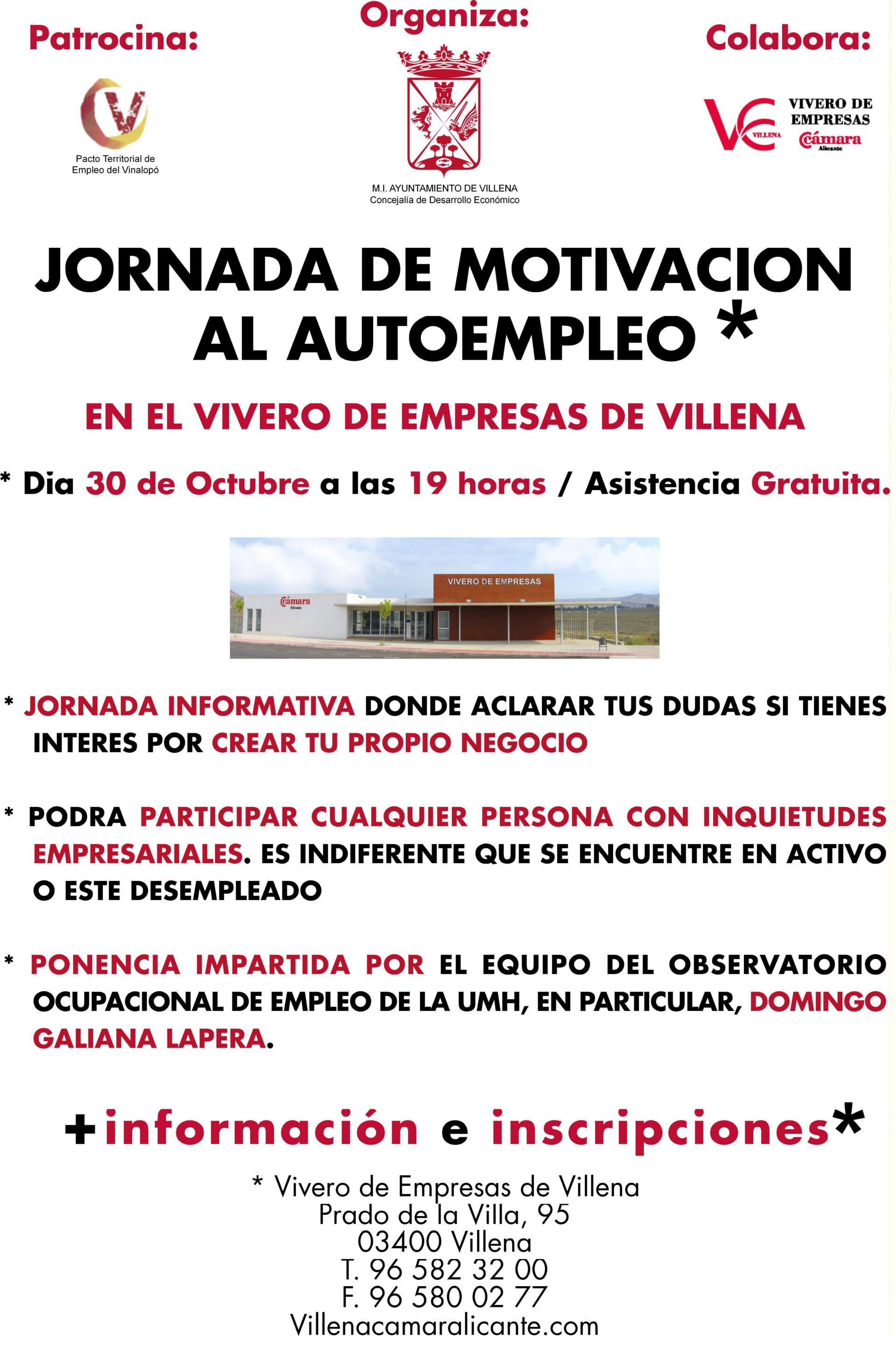 Los interesados deberán inscribirse en el Vivero de Empresas de Villena, sito en prado de la Villa, nº 95 o llamando al 96 582 32 00.