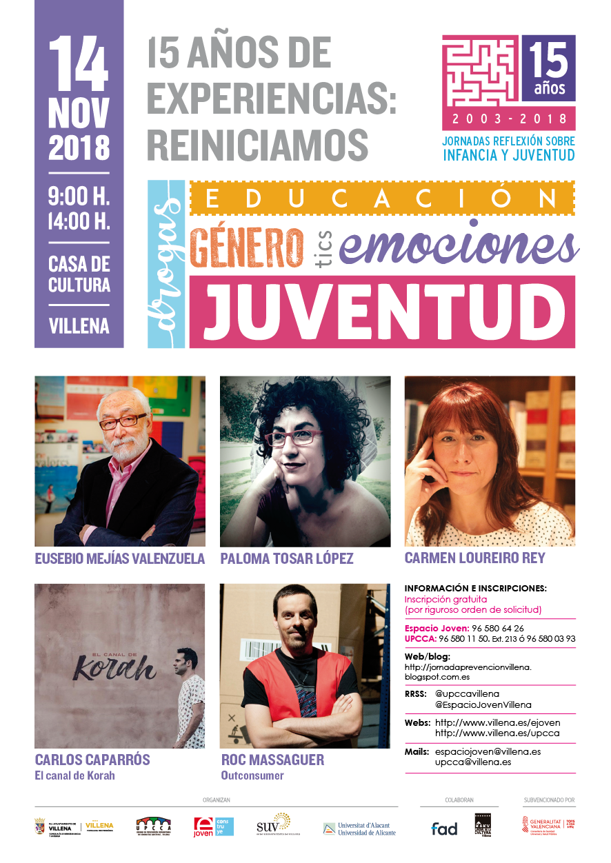 Las conocidas como jornadas de infancia y juventud cumplen quince años en Villena con una nueva edición que tendrá lugar el próximo miércoles 14 de noviembre en el salón de actos de la Casa de Cultura. Están organizadas por las concejalías de Bienestar Social, Juventud e Igualdad a través de los departamentos de la UPCCA, el Espacio Joven y el Espacio de Igualdad, además de la Sede Universitaria de la Universidad de Alicante.