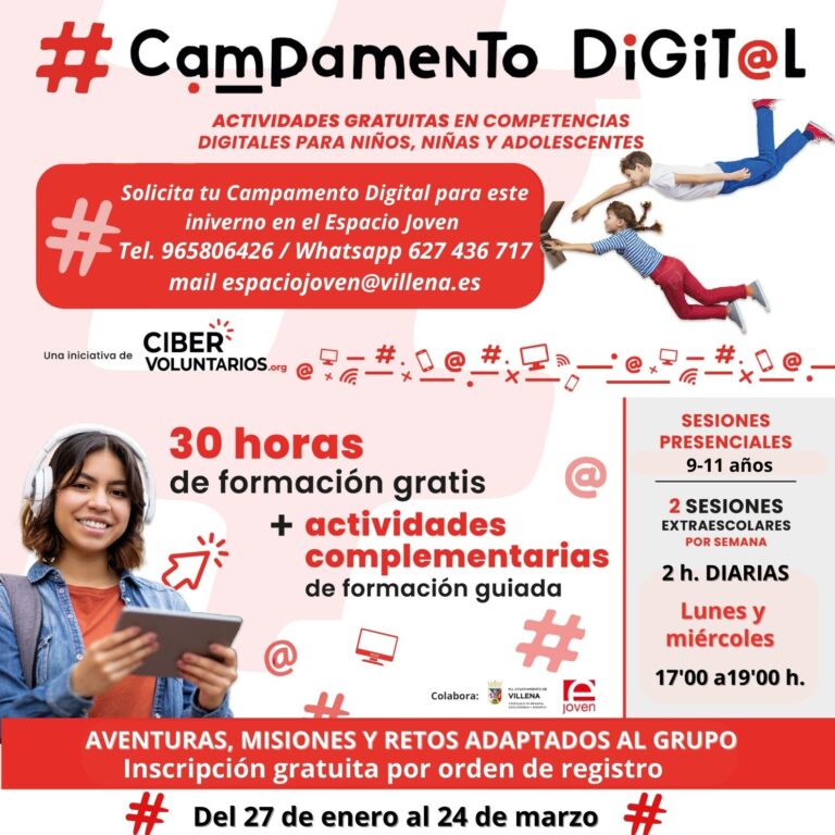 La Concejalía de Infancia y Juventud ha abierto el plazo de inscripción para participar en la edición del Campamento Digital, un programa de ocio formativo para menores de 9 a 11 años. Se trata de una actividad tecnológica gratuita que se desarrollarán en las instalaciones del Espacio Joven de Villena a partir del próximo 27 de enero.
