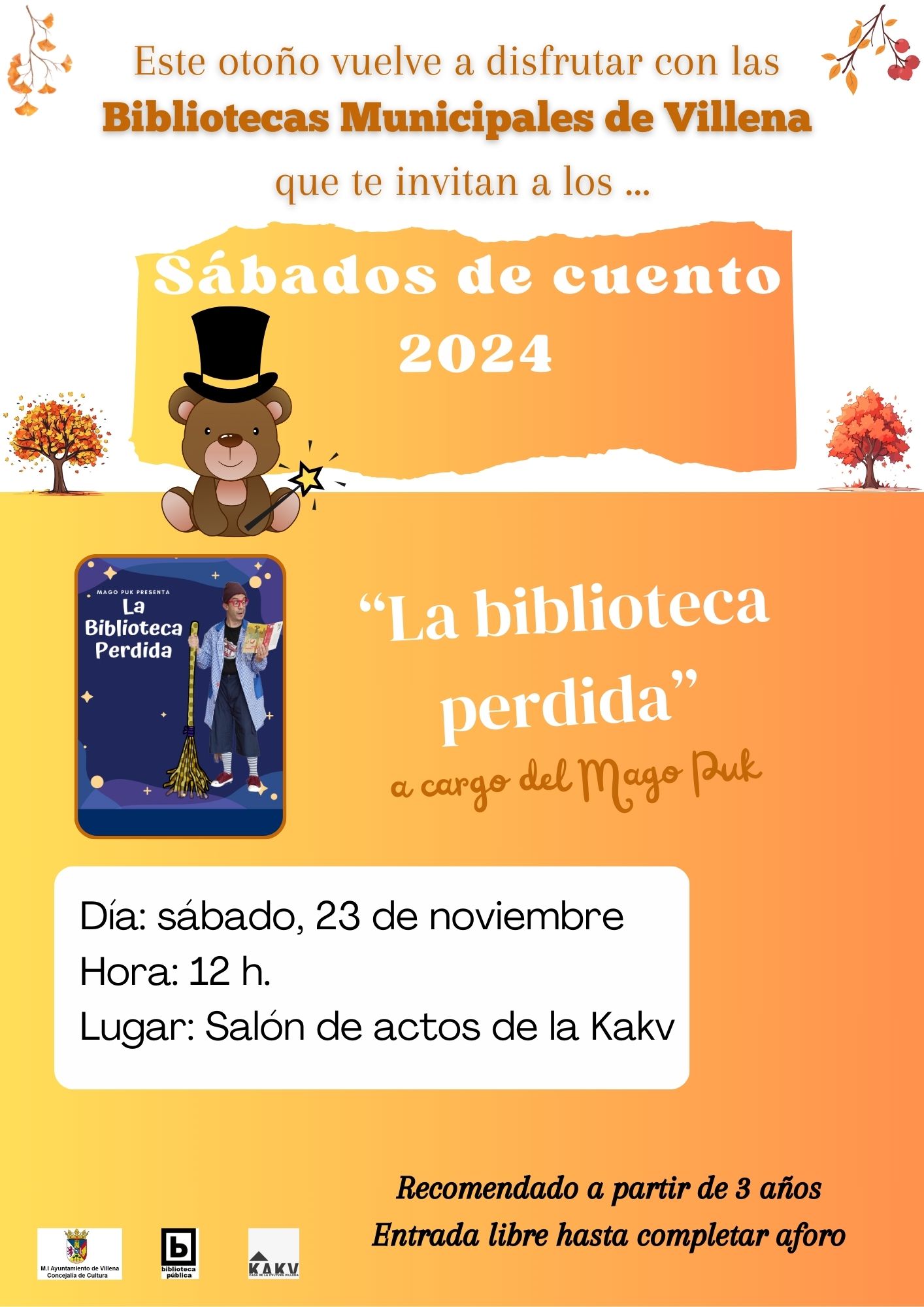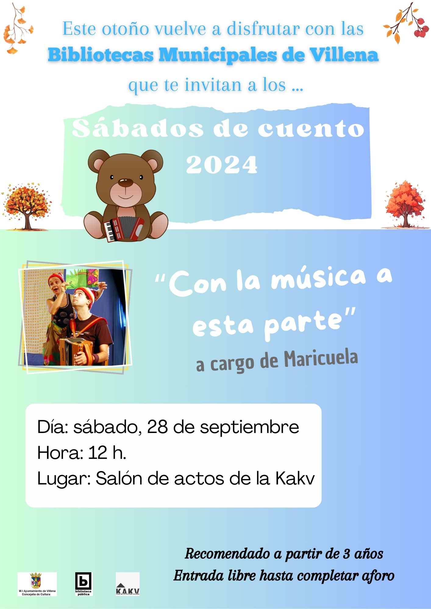 La Biblioteca municipal Miguel Hernández de Villena arranca esta semana su campaña otoñal ‘Los sábados de cuentos’ para el público infantil con la programación de tres actividades para menores a partir de tres años. La primera cita tendrá lugar este sábado, 28 de septiembre, de la mano de la narradora Maricuela y su espectáculo ‘¡Con la música a esta parte!’. Las representaciones son de acceso gratuito los sábados a las 12.00 horas en la Casa de la Cultura.