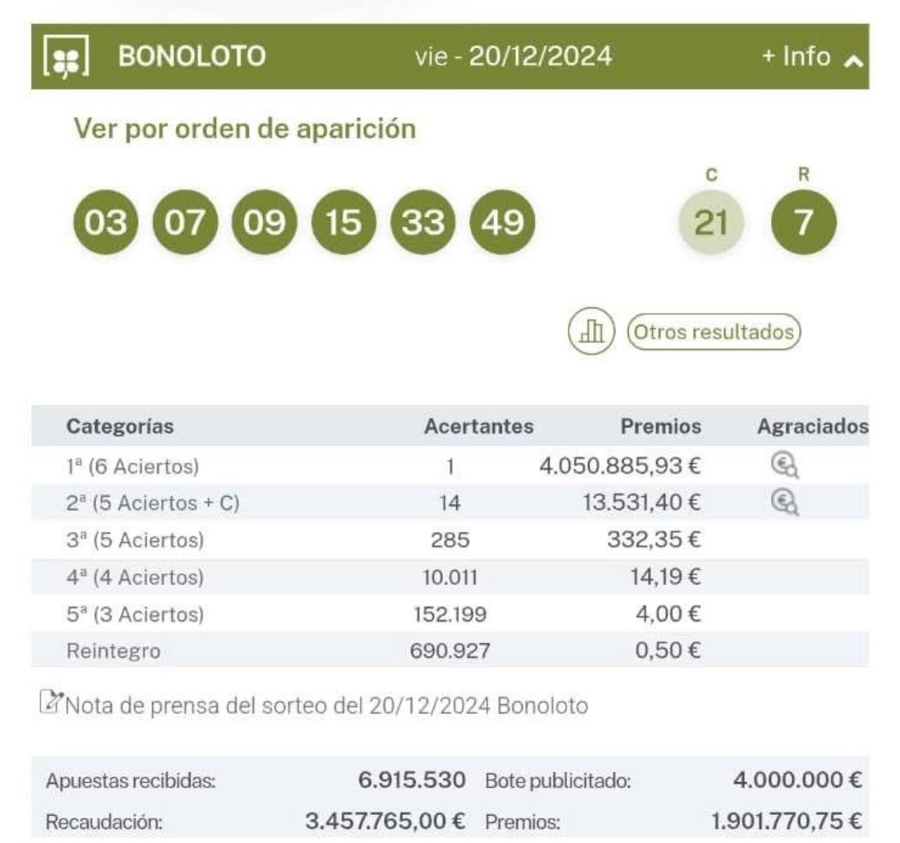 La combinación ganadora de este sorteo, correspondiente al 20 de diciembre, estuvo compuesta por los números 3, 7, 9, 15, 33 y 49, con el número complementario 21 y el reintegro 7. En total, la recaudación del sorteo ascendió a 3.457.765 euros.