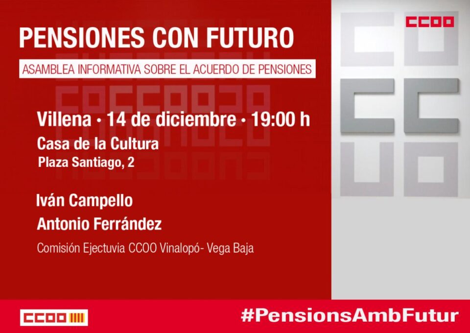 Mañana martes 14 de diciembre por la tarde a las 19 h. en la Casa de cultura de Villena tendrá lugar la asamblea informativa sobre el nuevo acuerdo de pensiones. La campaña de la Secretaría de Políticas Públicas y Protección Social de CCOO PV, en colaboración con la Federación de Pensionistas de CCOO PV, pretende explicar los aspectos más relevantes del acuerdo, como la derogación de las medidas más lesivas de la reforma de pensiones de 2013. CCOO Vinalopó-Vega Baja acogerá cuatro asambleas: Elda, Villena, Torrevieja y Orihuela. Las intervenciones correrán a cargo de Iván Campello y Antonio Ferrández, de la Comisión Ejecutiva de CCOO Vinalopó- Vega Baja y la presentación a cargo de Manuela Vera Secretaria de juventud de CC.OO. V-VB.