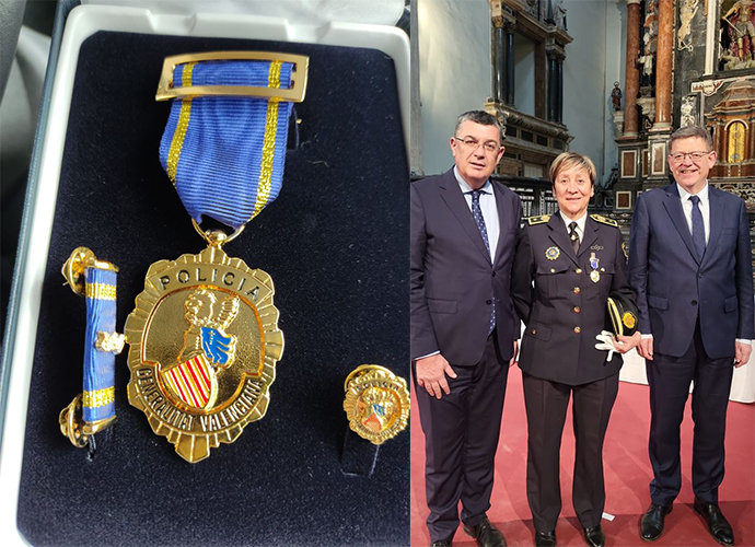 En el acto de entrega celebrado ayer estuvo acompañada por el edil de Seguridad y Tráfico, Andrés Martínez, y tuvo lugar en el Monasterio de San Miguel de los Reyes en Valencia, donde se celebró el Día de la Unidad de Policía Nacional Adscrita a la Comunitat Valenciana. Junto a la Comisaria Inmaculada Soriano, también han sido condecorados funcionarios de la Policía Nacional, Unidad Adscrita, Guardia Civil y de otros Cuerpos de Policía Local, con la condecoración de oro, planta o bronce, según el caso.