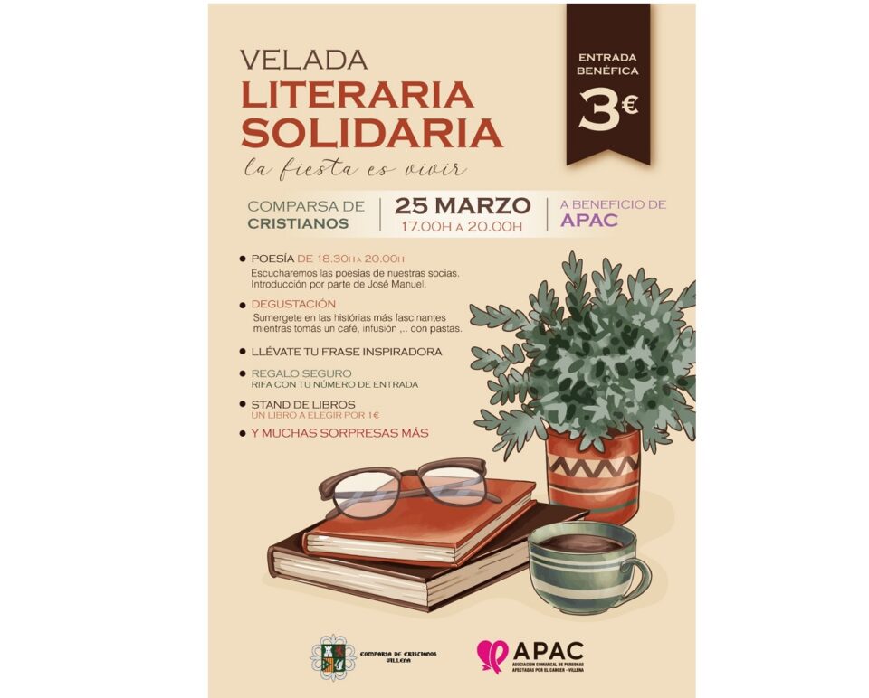La Comparsa de Cristianos colabora con APAC (asociación personas afectadas por el cáncer), con esta velada literaria, el próximo 25 de marzo, sábado, en la sede de nuestra comparsa, plagada de sorpresas y regalos. Con tu entrada, un detalle seguro. Y un rato para disfrutar de un café en compañía, escuchar textos, comprar libros a un euro y sorprenderte con muchos rincones preparados para pasar una tarde de sábado diferente. Por solo 3 euros, puedes ayudar a mucha gente.
