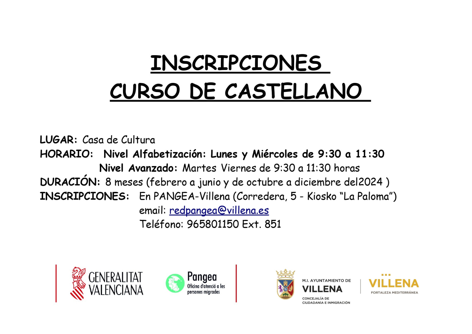 Las clases se dividen en dos grupos: un grupo de alfabetización, que se impartirá los lunes y miércoles de 9:30 a 11:30 horas y un grupo de nivel avanzado que será los martes y viernes de 9:30 a 11:30 horas. Las inscripciones deben realizar en la oficina de Pangea Villena en el Kiosco «La Paloma», Calle Corredera, 5. Las clases se impartirán en la Casa de Cultura.
