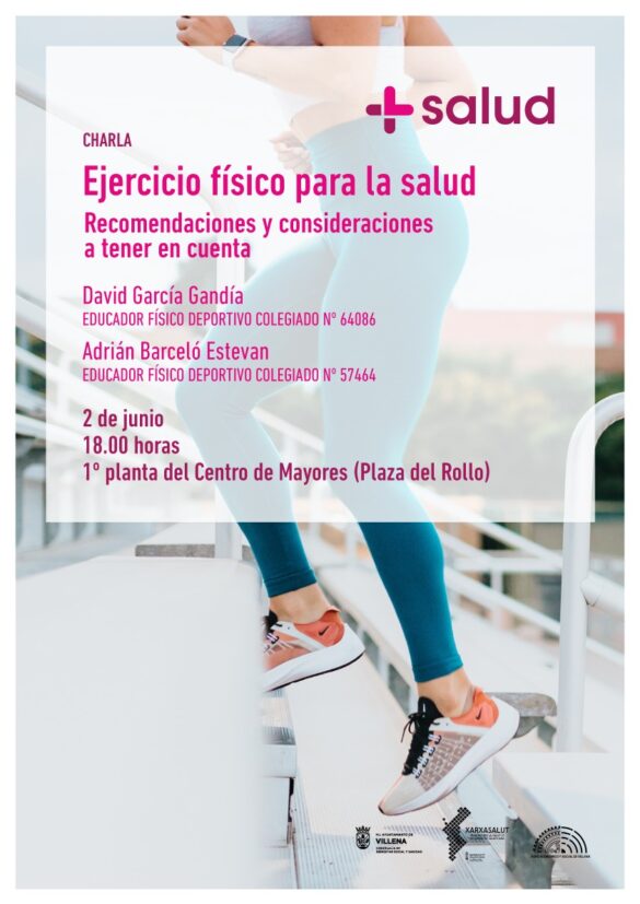 El 2 de junio, los educadores físicos deportivos David García y Adrián Barceló ofrecerán la charla ‘Ejercicio Físico para la Salud, recomendaciones y consideraciones a tener en cuenta’ en la 1º planta del Centro de Mayores a las 18.00 horas. En este caso, no es necesario inscripción.