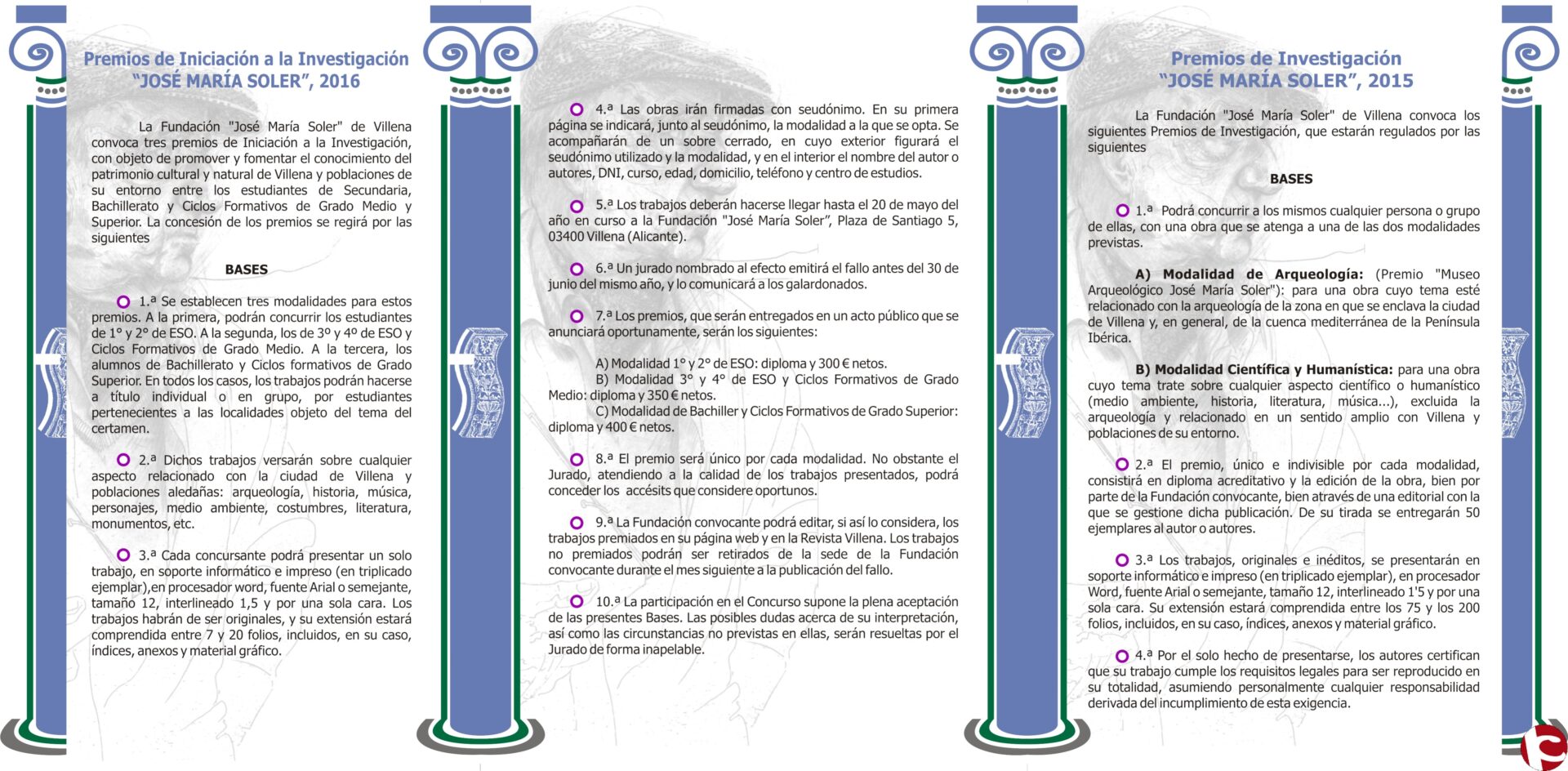 Los Premios de la Fundación José M.ª Soler instituidos en 1994 en memoria del ilustre investigador villenense, pretenden incentivar la investigación de nuestra tierra y sus habitantes, a la que éste dedicó gran parte de su vida, así como dar reconocimiento y difusión a aquellos trabajos que presenten una mayor calidad.