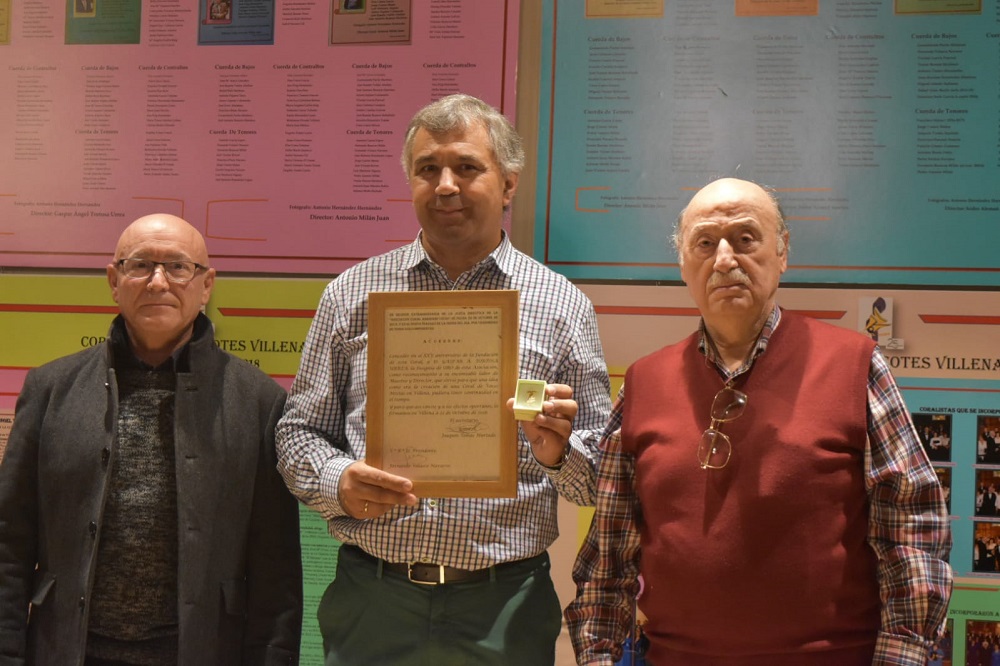 Gaspar Angel Tortosa Urrea y Antonio Milán Juan reciben, en la inauguración de la Exposición Fotográfica, la insignia de oro y plata concedida por la Coral Ambrosio Cotes como reconocimiento a su labor como directores durante más de 15 años, con motivo de la celebración del 25 aniversario de la fundación de esta Asociación Coral. También fue reconocido con una Mención Especial Antonio Hernández Hernández “El Ruso” por su labor como fotógrafo de la Coral, durante más de 20 años.