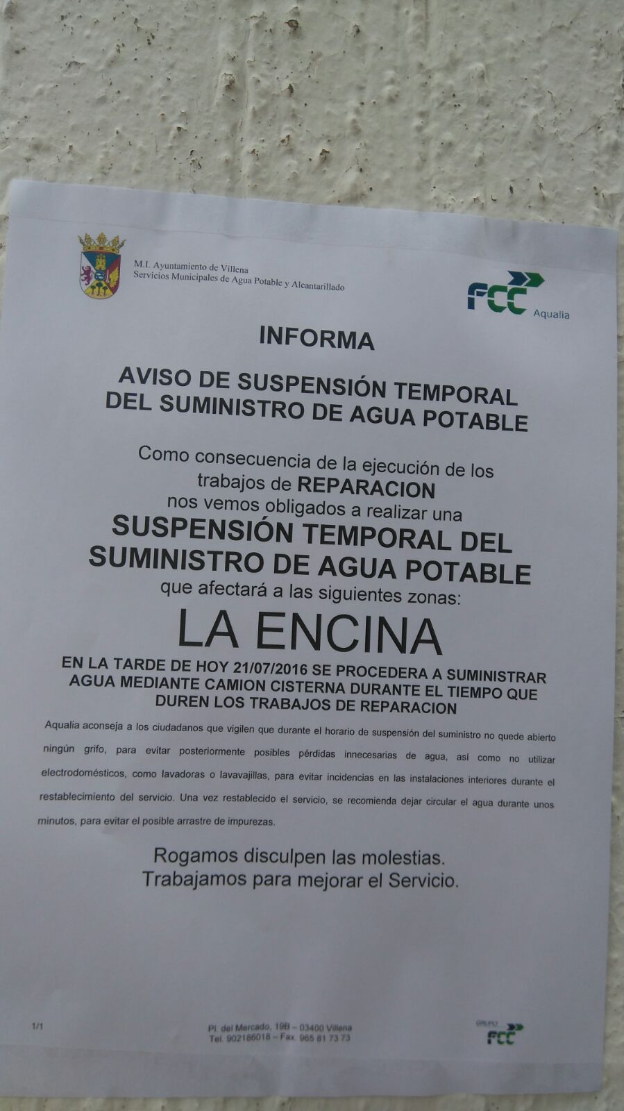 Desde la Concejalía de Ciclo Hídrico y Alcantarillados nos informan de la suspensión temporal del suministro de Agua Potable en La Encina.