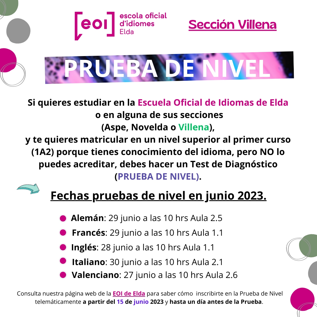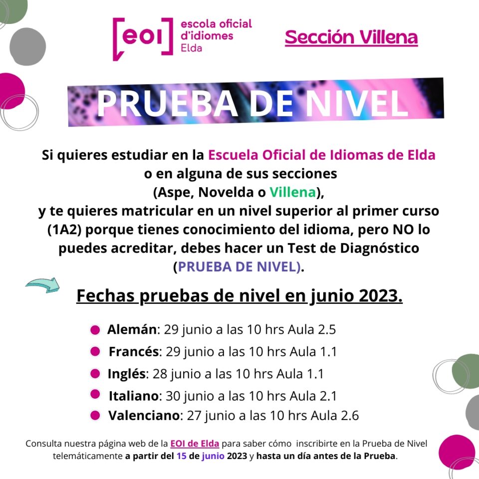 Todas las pruebas de nivel se efectuarán a las 10 horas. Los interesados e interesadas se podrán inscribir a la Prueba de Nivel de manera telemática a partir del 15 de junio y hasta un día antes de la prueba de forma online en la página web de la EOI de Elda.