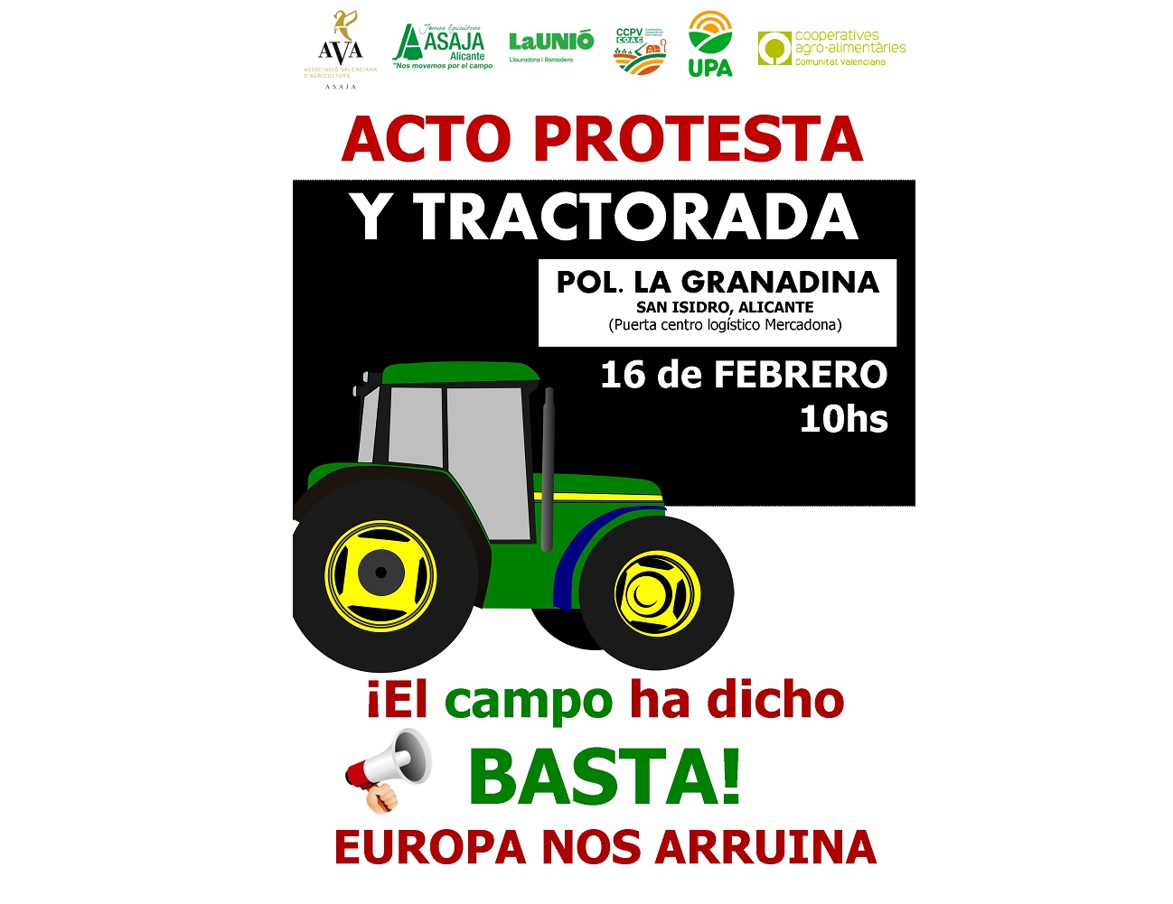 La unión hace la fuerza y las organizaciones agrarias de la Comunidad Valenciana buscan soluciones firmes y estables para la grave situación que atraviesa el campo español. En la provincia de Alicante, ASAJA Alicante, la Asociación Valenciana de Agricultores (AVA-ASAJA), LA UNIÓ Llauradora i Ramadera, la Coordinadora Campesina del País Valenciano (CCPV-COAG) y la Unión de Pequeños Agricultores y Ganaderos (UPA-PV), con el apoyo de las Cooperatives Agro-alimentàries de la Comunitat Valenciana realizarán una protesta y tractorada el viernes 16 de febrero que cortarán las carreteras desde Orihuela y Villena, con un acto que tendrá lugar en el Polígono Industrial la Granadina en San Isidro, Alicante, a partir de las 10 horas y del que se informarán más detalles en los próximos días.