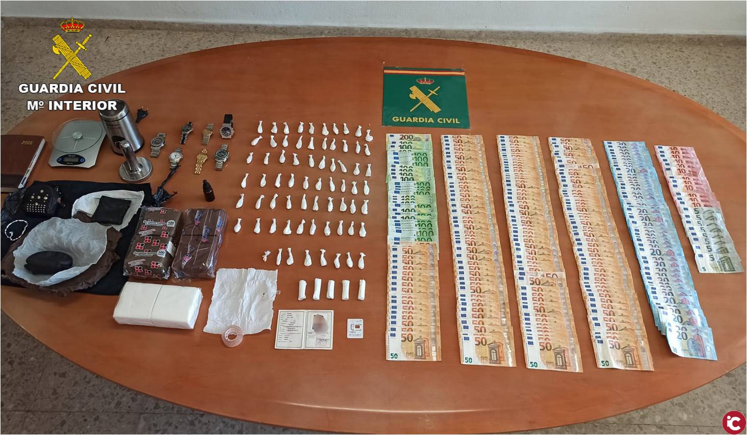 En dicho registro se incautaron 74 dosis de cocaína, 12.270 euros en metálico, 3.878 euros en criptomonedas de un monedero digital, documentación falsa, sustancia apta para el corte de cocaína y siete relojes de alta gama.
