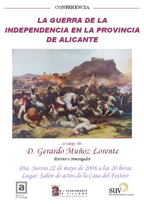 El jueves día 22 de mayo a las 20 horas en el salón de actos de la Casa del Festero, tendrá lugar la conferencia que, bajo el título La Guerra de la Independencia en la Provincia de Alicante, ha organizado el Archivo Municipal de Villena. Será impartida por el Escritor e Investigador D. Gerardo Muñoz Lorente.