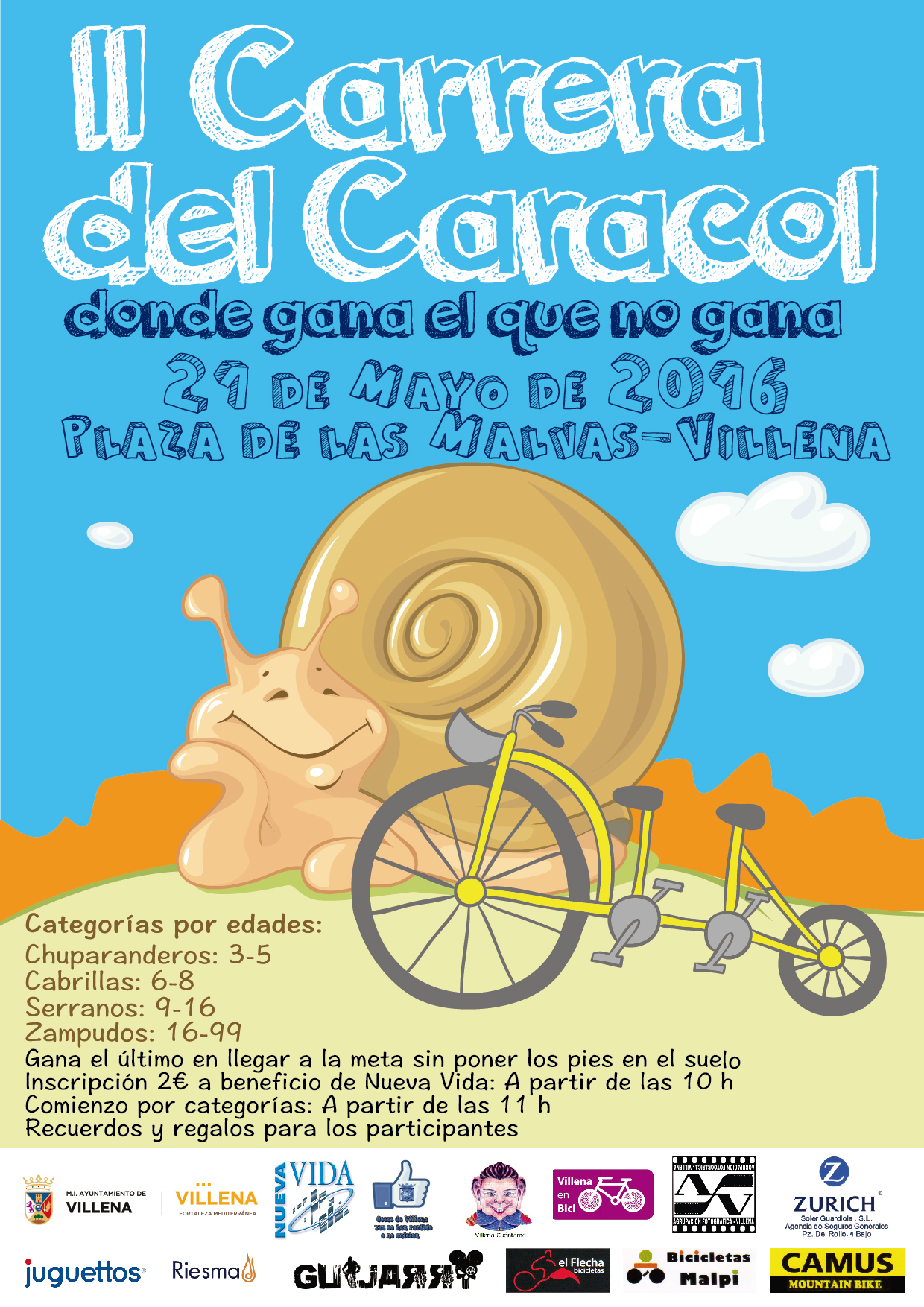 La Carrera del Caracol está organizada por la concejalía de Bienestar Social junto a la asociación de jugadores rehabilitados Nueva Vida, Villena en Bici y Villena Cuéntame. Tendrá lugar a partir de las 10:00 en la Plaza de Las Malvas y el objetivo es reivindicar el juego tradicional y desligarlos del factor económico, lucrativo y competitivo.