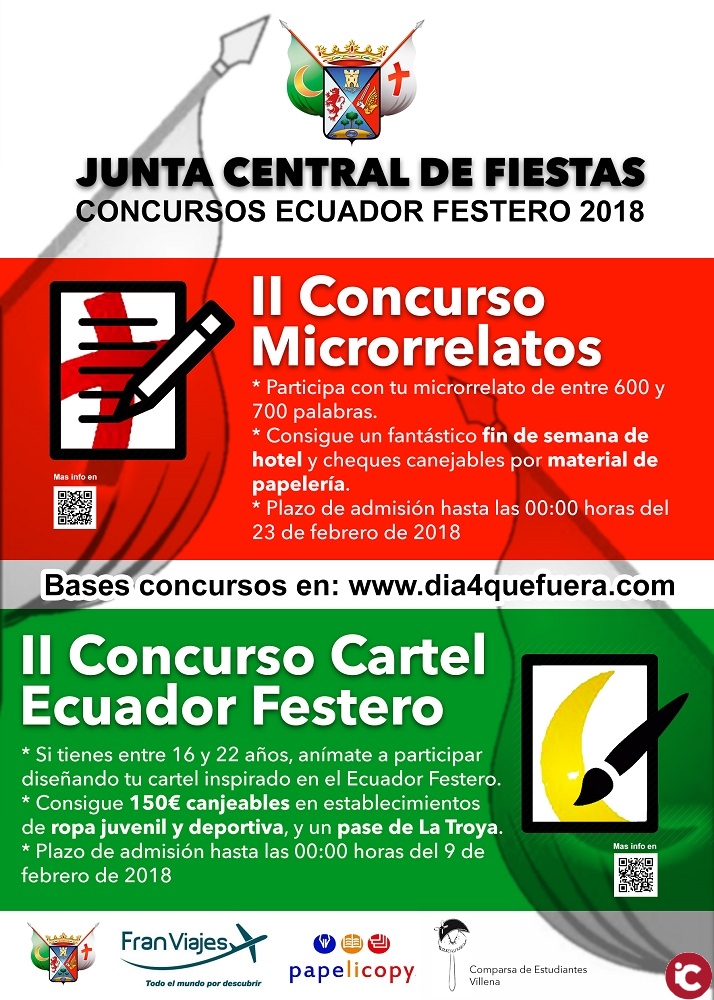 La Junta Central de Fiestas de Moros y Cristianos de Villena convoca, con motivo de la celebración del Ecuador Festero 2018, el II Concurso de microrrelatos Ecuador Festero 2018, y el II Concurso Juvenil del Cartel del Ecuador Festero 2018, para elegir el cartel que anunciará el Medio Año Festero 2018 a celebrar en Villena el próximo mes de marzo.