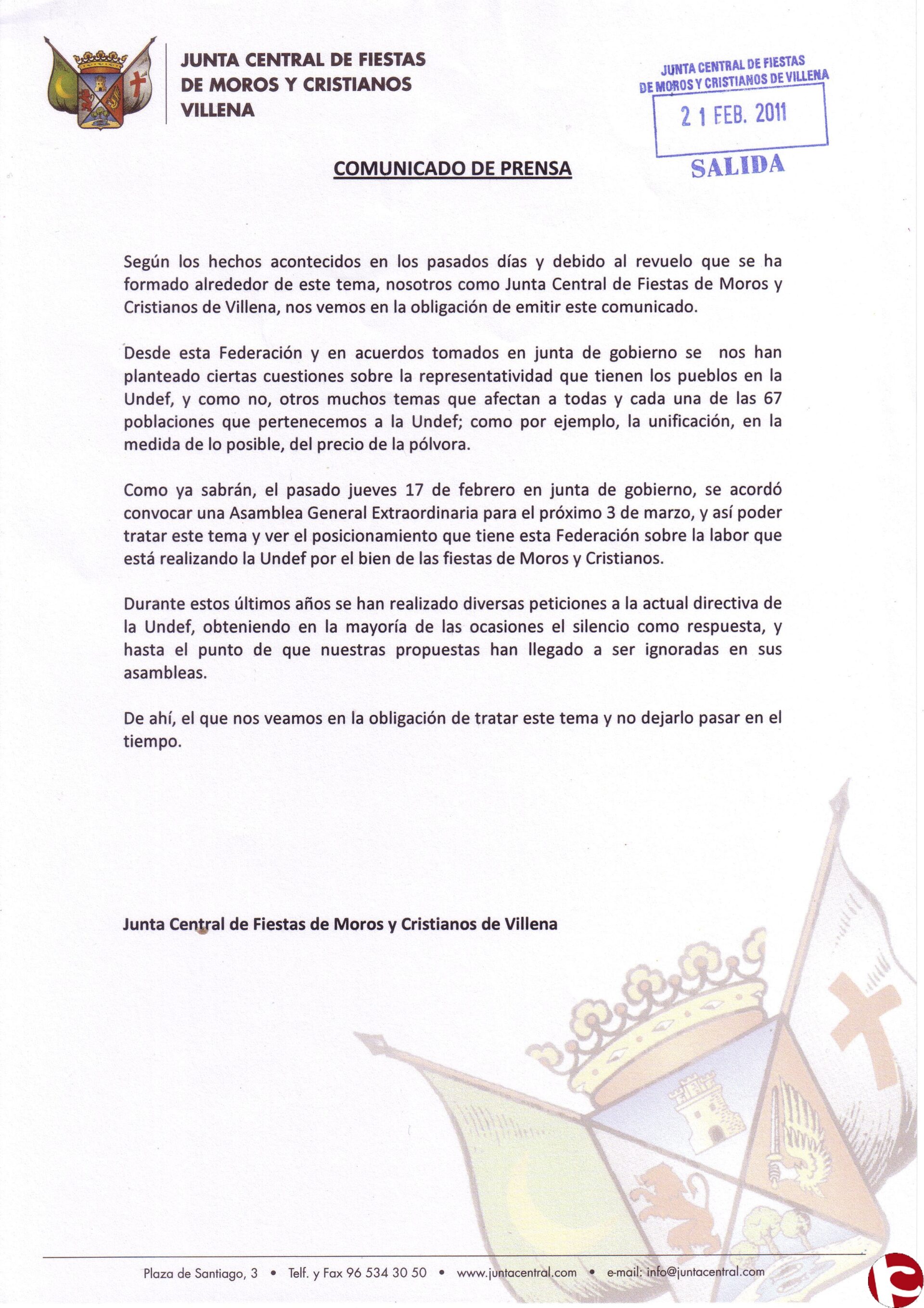 Adjuntamos seguidamente el comunicado que desde la Junta Central de Fiestas nos remiten sobre diversas anomalías que valoran de la UNDEF.