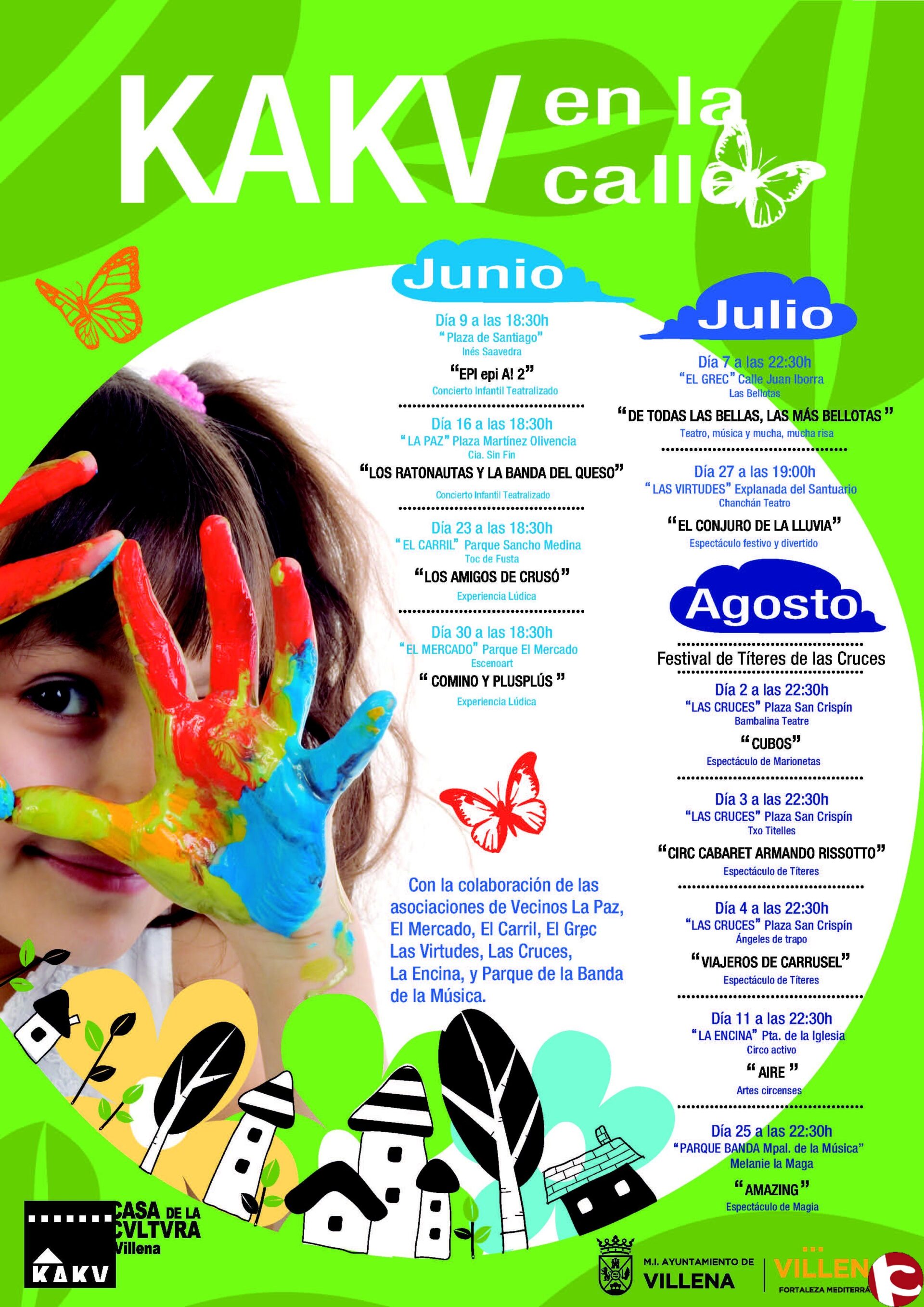 El último jueves del mes de julio la Kakv en la Calle se desplazará hasta Las Virtudes y posteriormente y en el mes de agosto tendrá lugar el 23 Festival de Títeres Las Cruces, un espectáculo circense en La Encina, que se incorpora por primera vez en la programación estival de la Kakv. Cerrará el programa, como viene siendo habitual, un espectáculo de magia en el Parque de la Banda de Música, en este caso realizado por Melaníe: una maga que, pese a su juventud, está revolucionando los escenarios del ilusionismo en nuestro país a juicio de la crítica especializada.