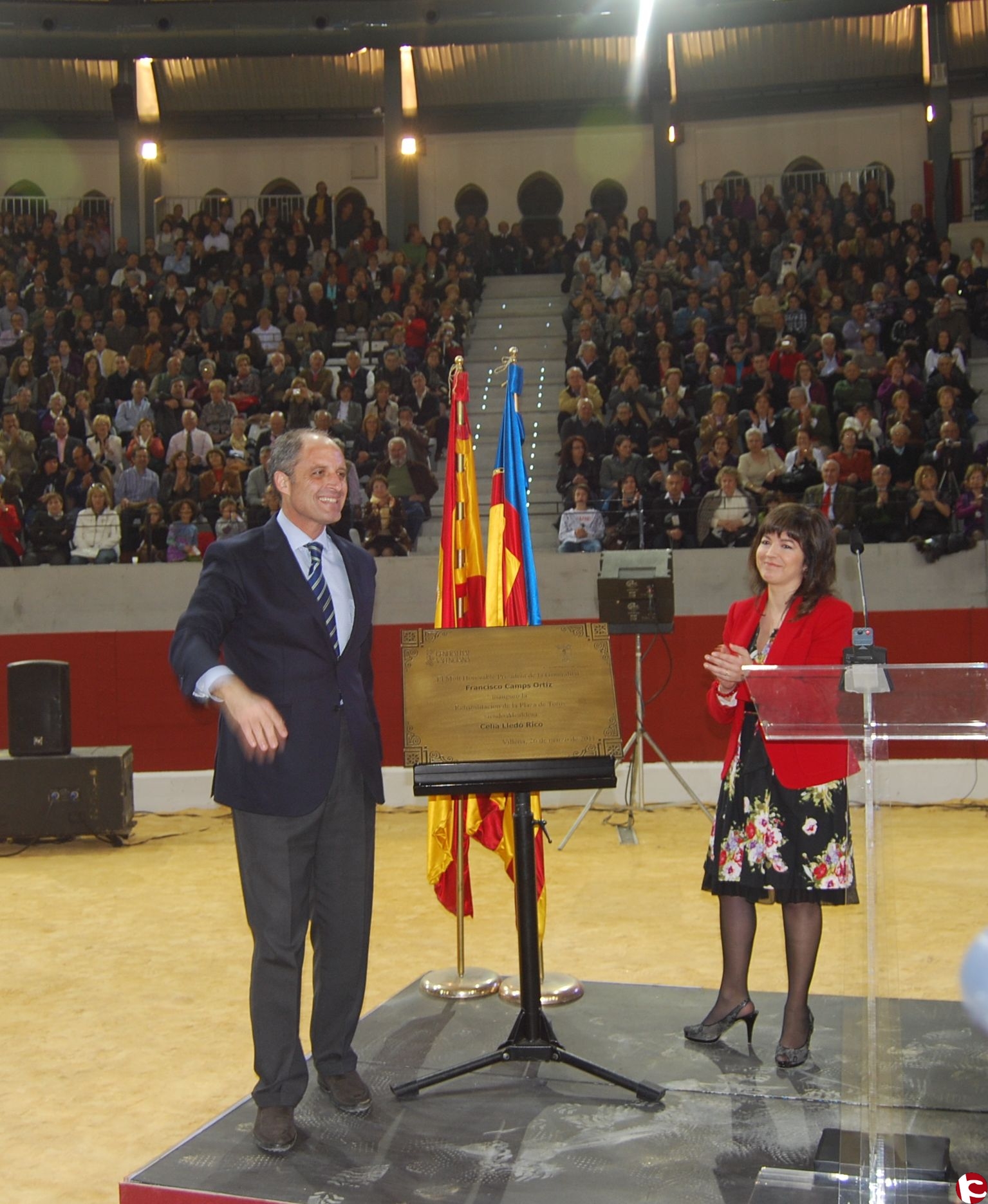 El presidente de la Generalitat, Francisco Camps y una buena parte del Gobierno Valenciano, han acompañado a la alcaldesa Celia Lledó en la reinauguración de esta plaza que ahora se ha convertido en un moderno recinto cubierto multifuncional.