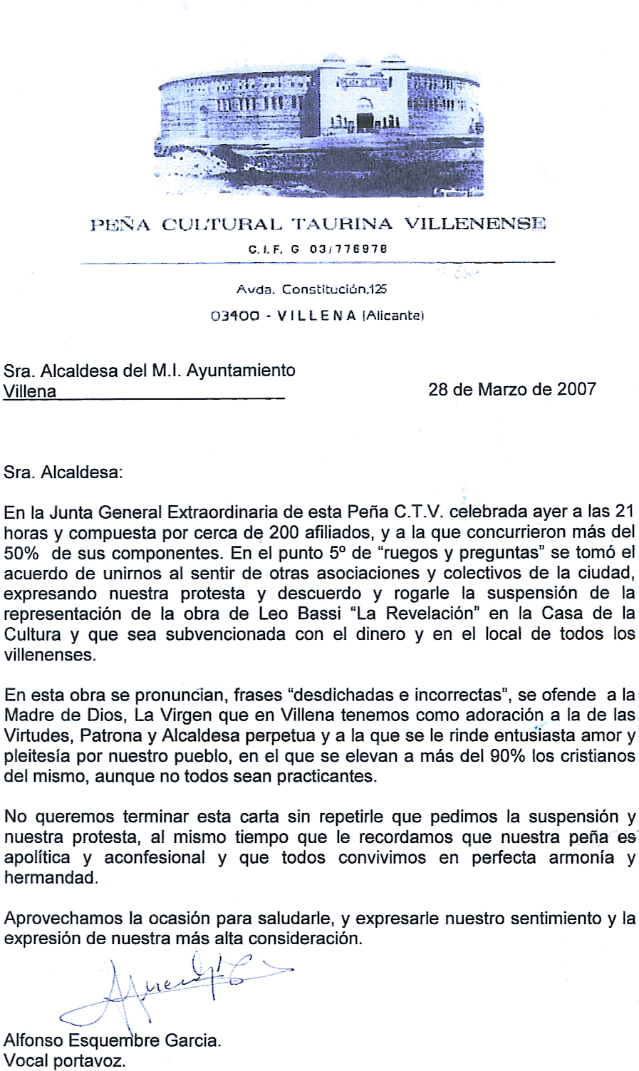 En la junta extraordinaria de la Peña Cultural Taurina villenense, compuesta por 200 socios afiliados, y a la que concurrieron más del 50% de sus componentes, en el punto 5º, se tomó el acuerdo de unirnos al sentir de otras asociaciones y colectivos de la ciudad, expresando nuestra protesta y desacuerdo y rogarle la suspensión de la representación de la obra de Leo Bassi La Rebelión en la Casa de Cultura y que sea subvencionada con el dinero y en el local de todos los villenenses.