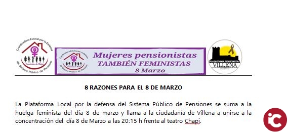 La Plataforma Local por la defensa del Sistema Público de Pensiones se suma a la huelga feminista del día 8 de marzo y llama a la ciudadanía de Villena a unirse a la concentración del día 8 de Marzo a las 20:15 h frente al teatro Chapi.