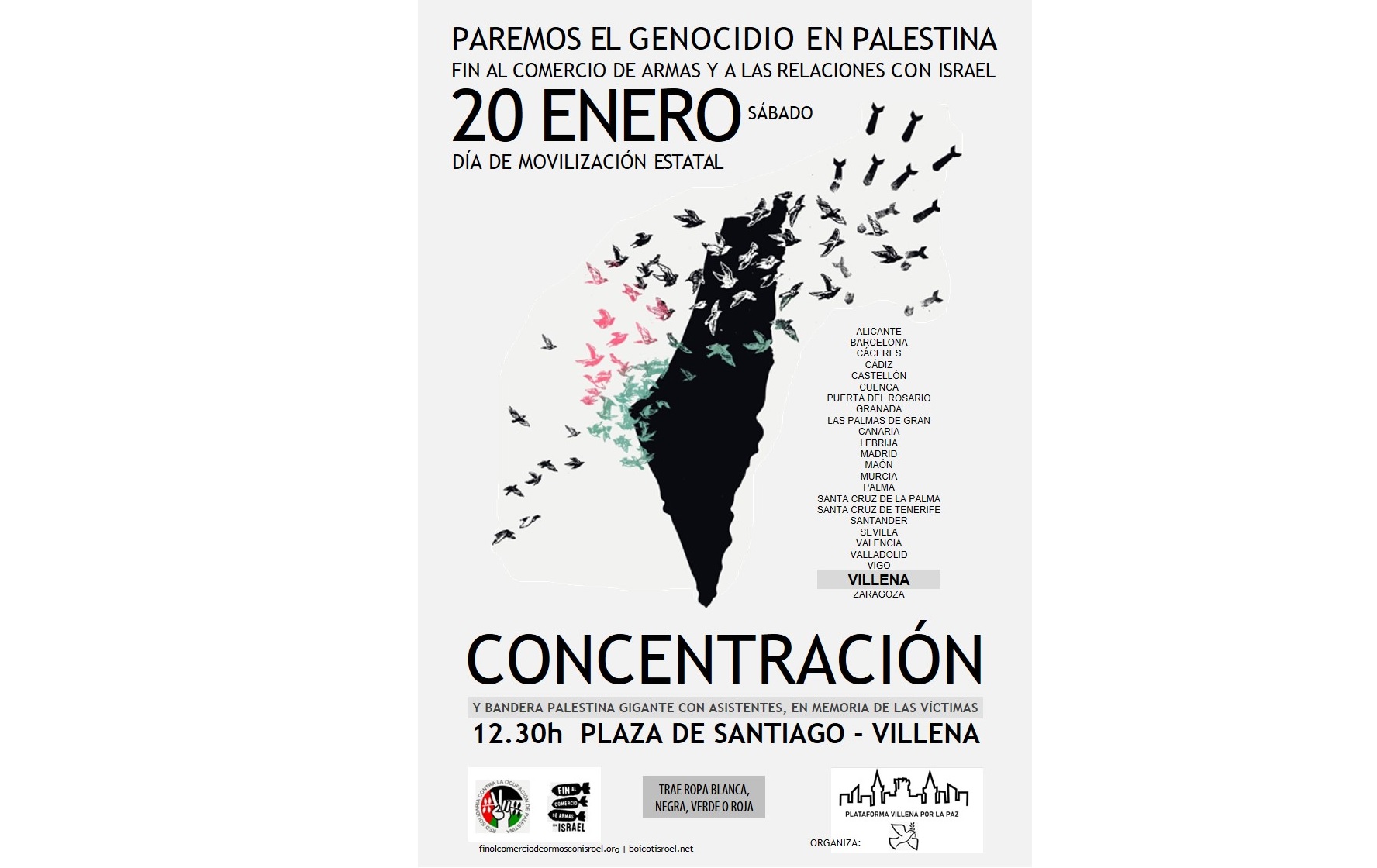 El próximo sábado 20 se organiza en Villena, junto a cientos de ciudades de toda España ( en cartel sólo figuran algunas importantes) manifestaciones y concentraciones para exigir que se detenga el Genocidio sobre el pueblo Palestino. Para que se detenga la masacre de Israel. Y exigir alto el fuego y soluciones pacíficas y diplomáticas de inmediato. En Villena se hará una concentración con una performance. Una bandera humana gigante en la plaza de Santiago con cientos de personas a las que se le facilitará vestimenta de la bandera palestina: roja, verde, blanca y negra.