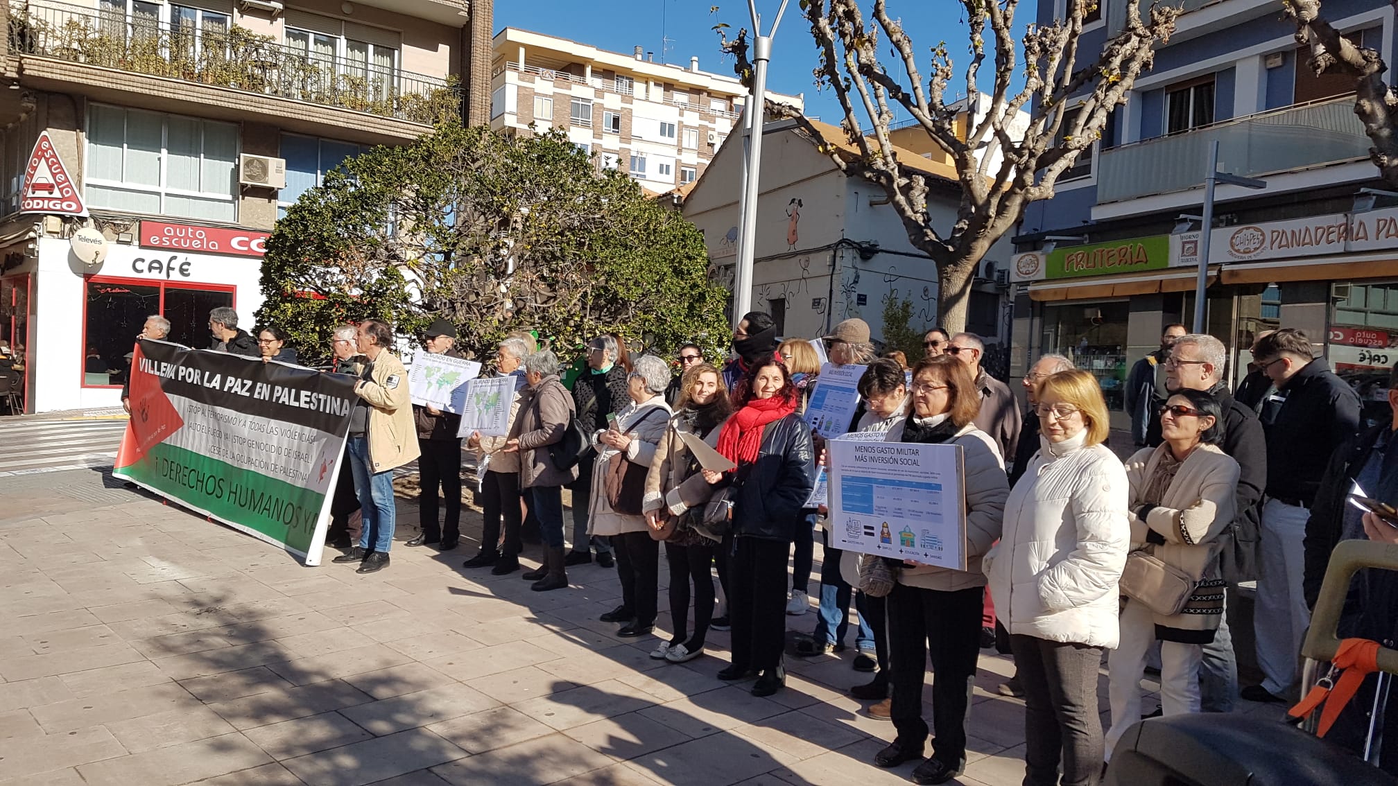 En una mañana soleada, desde las 11:30 personas afines a la plataforma pacifista fueron concentrándose en la avenida de la Constitución desplegando, junto a su habitual  pancarta en contra del genocidio en  Gaza,  carteles alusivos al incremento de los gastos militares y al gran número de guerras vigentes. En ellos se podían ver la distribución geográfica de los conflictos y las equivalencias entre el dinero dedicado a armamento y las posibles inversiones en necesidades sociales.
