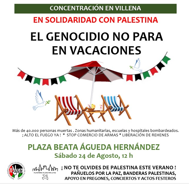 Por todo ello se invita a la población de Villena que aproveche el momento vacacional y festero para unirse a esta concentración y mostrar así su repulsa a la guerra en Gaza.