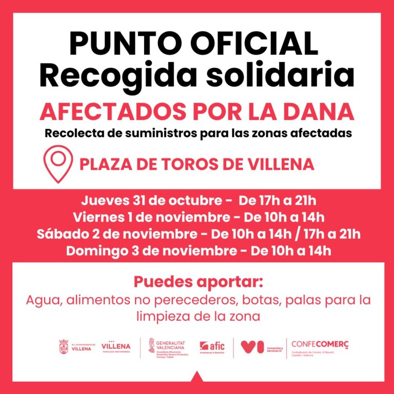 Esta campaña de ayuda, que parte de Confecomerç (Confederación de Comercio de Alicante, Castellón y Valencia), se canalizará en la Plaza de Toros de Villena desde hoy, jueves 31 de octubre, hasta el domingo día 3 de noviembre.