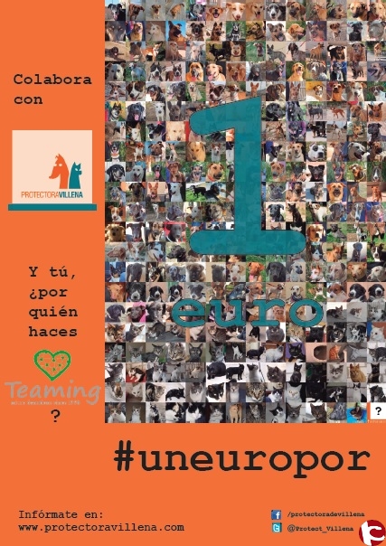 https://www.teaming.net/protectoradevillena y registrarte. En el momento en que te registres, te enviaremos la foto de uno de los animales que se encuentran en el albergue para que la pongas en tu perfil teaming y lo difundas, será por quien dones tu euro mensualmente.