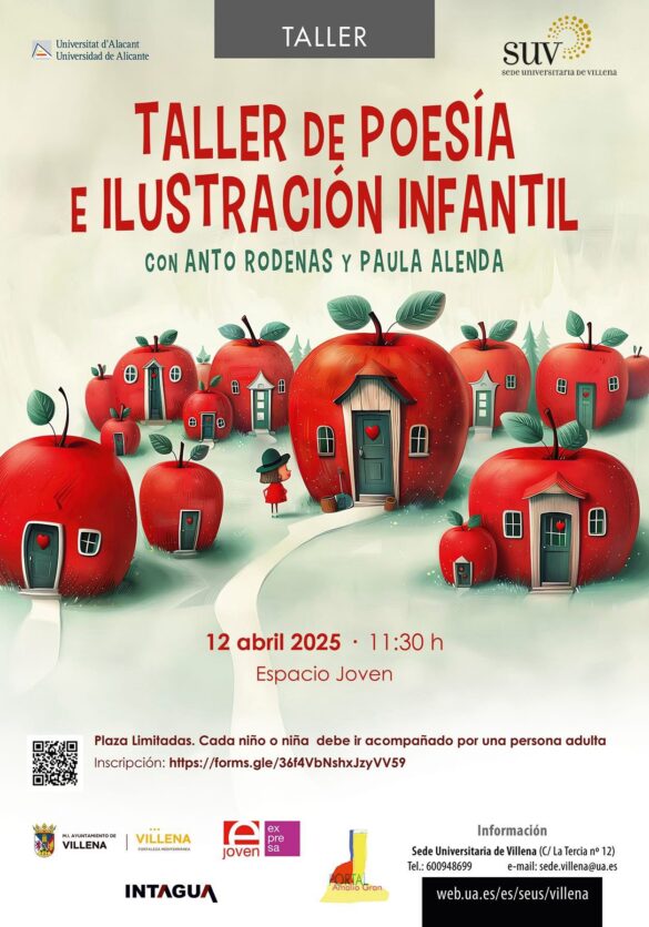 Dentro de esta misma semana cultural, el viernes 12 de abril se celebrará un Taller de Poesía e Ilustración Infantil dirigido a familias con niños y niñas de hasta 12 años. El taller será impartido por la escritora Anto Rodenas y la ilustradora Paula Alenda, ambas con una destacada trayectoria en el ámbito de la literatura y la ilustración infantil.