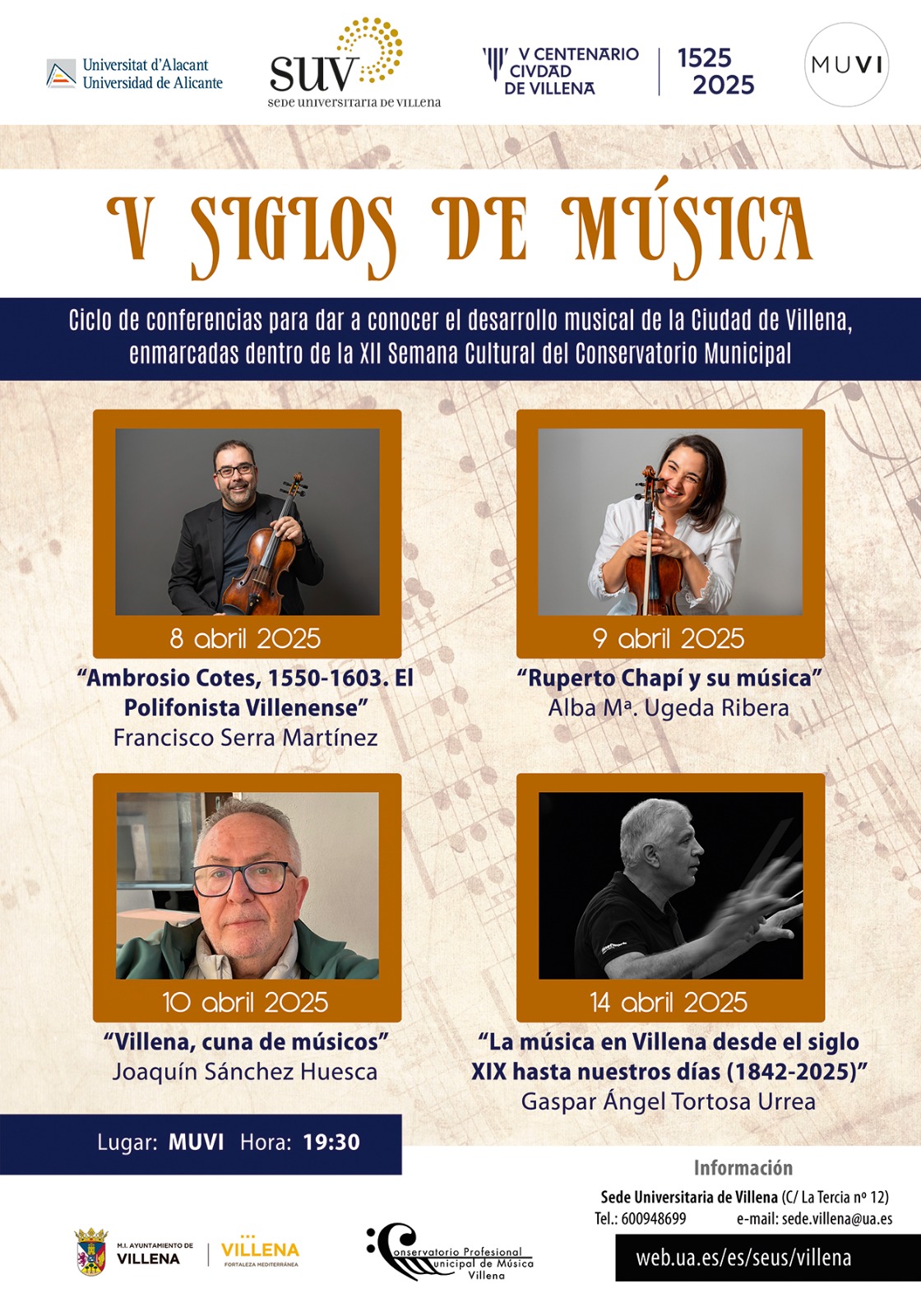 La Sede Universitaria de la Universidad de Alicante en Villena participa en la XII Semana Cultural del Conservatorio Profesional de Música con un ciclo de conferencias centrado en la vinculación histórica de Villena con la música, dentro de los actos conmemorativos del V Centenario del Título de Ciudad.