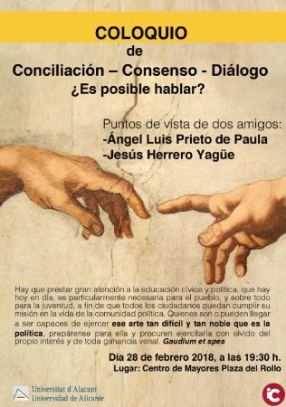 El pròxim dimecres 28, a les 19:30 hores, al Centre de Majors Plaça del Rollo de Villena, Ángel Luis Prieto de Paula, catedràtic de Literatura Espanyola a la Universitat d’Alacant i l’escriptor, Jesús Herrero conduiran el col·loqui titulat “Conciliació, consens i diàleg. És possible parlar-ne?