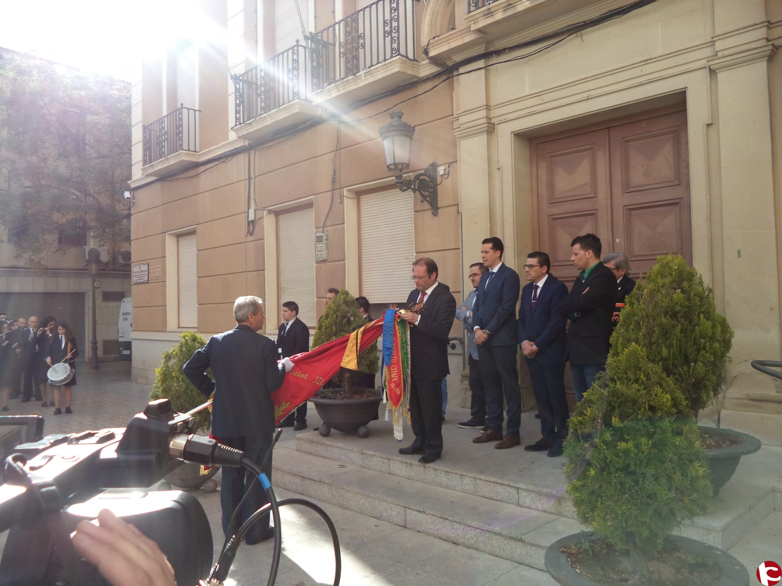 La tarde se inició recibiendo a las bandas participantes en la puerta del Ayuntamiento y colocando un corbatín de recuerdo a las banderas. A continuación la Sociedad Musical interpretó el pasodoble “Pedro y Juan Bautista «, del recordado compositor Pedro J. Francés Sanjuán, por las calles de Elda hasta llegar a la puerta del Teatro.