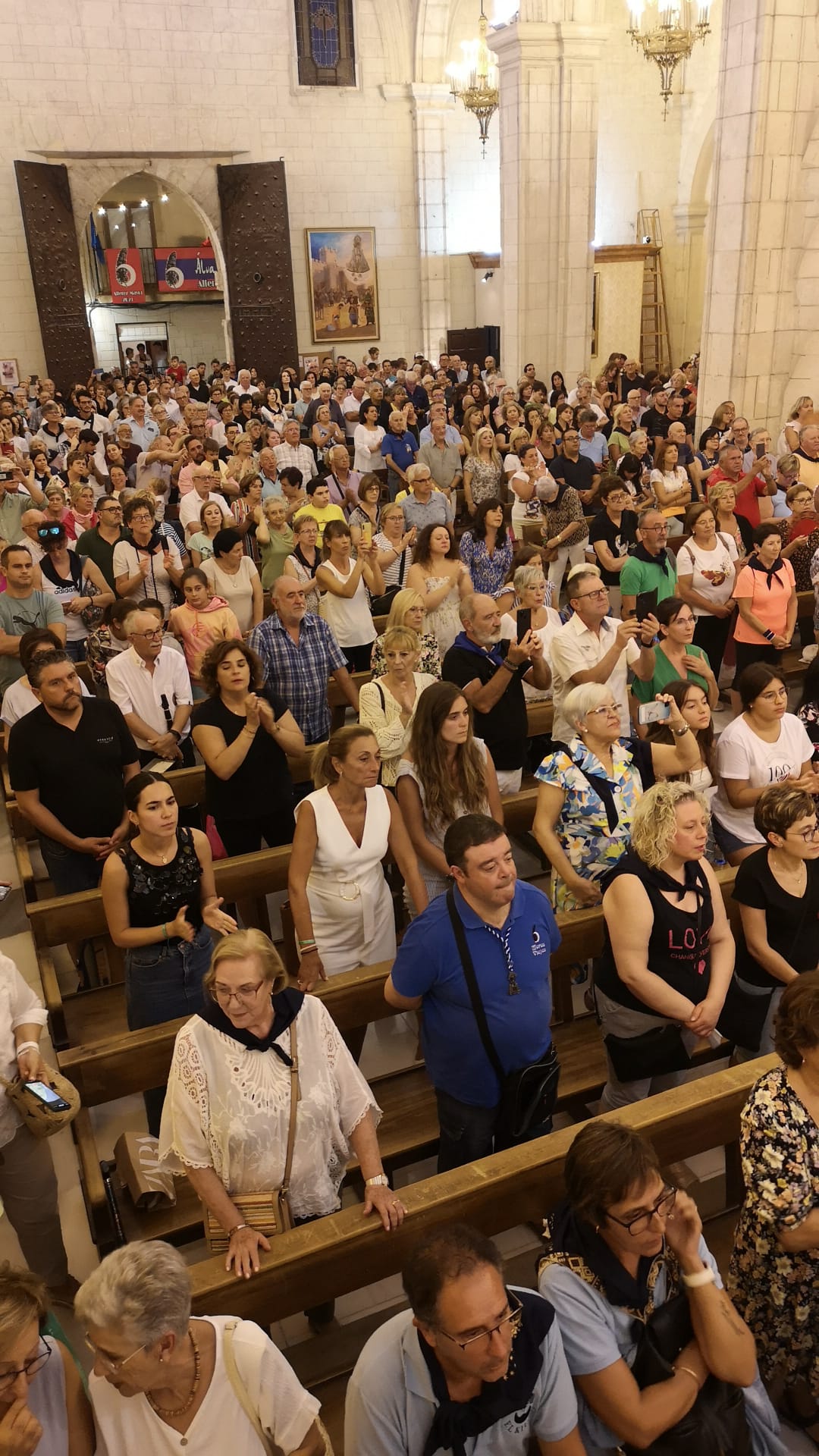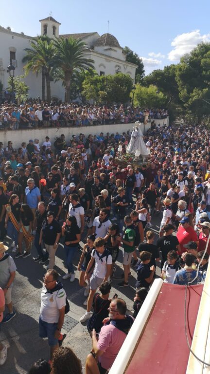 Salida en ROMERÍA, acompañando a la Santísima Virgen, María de las Virtudes hacia Villena. El club colombófilo “Salvatierra”, ha soltado palomas a la salida de la Sagrada Imagen por la portalada del Santuario, acompañado con salvas de ARCABUCERÍA por los componentes del Grupo de Arcabuceros de la Comparsa de Piratas.