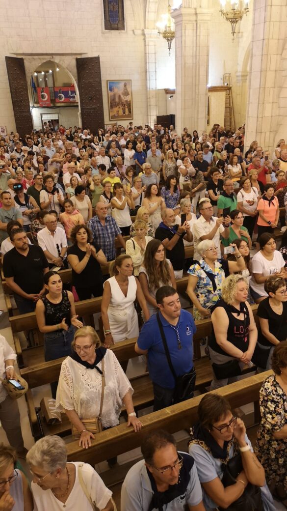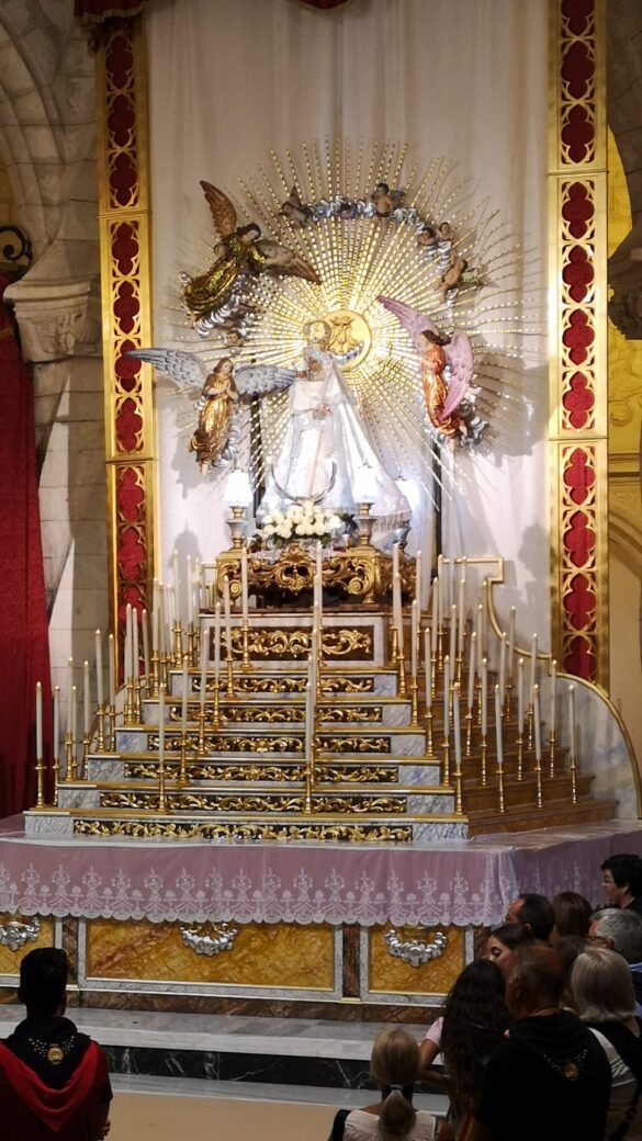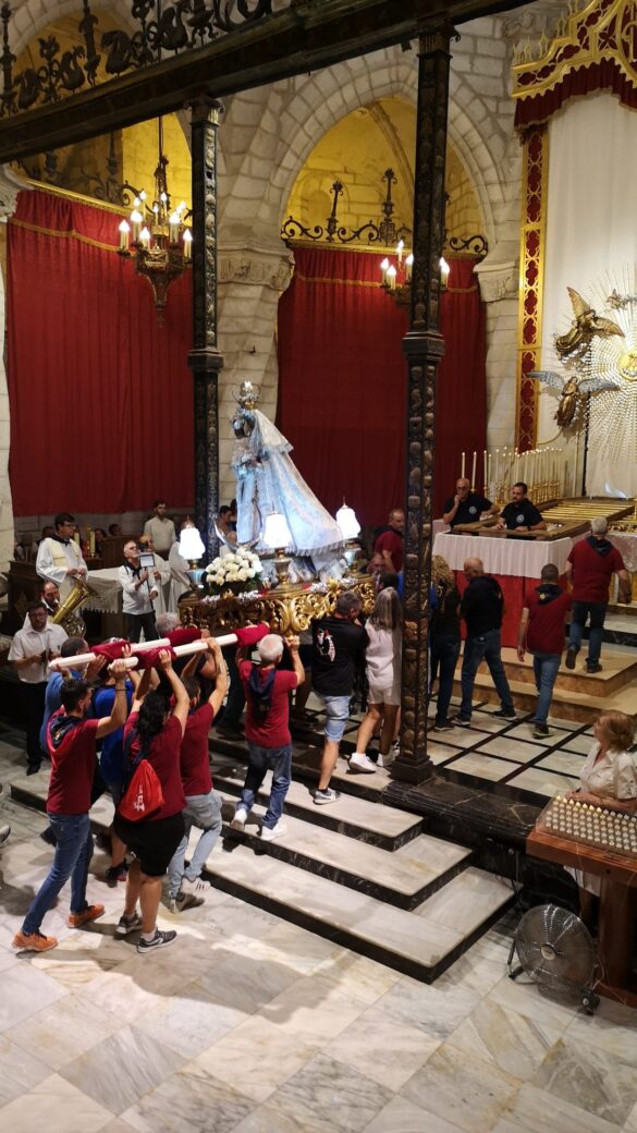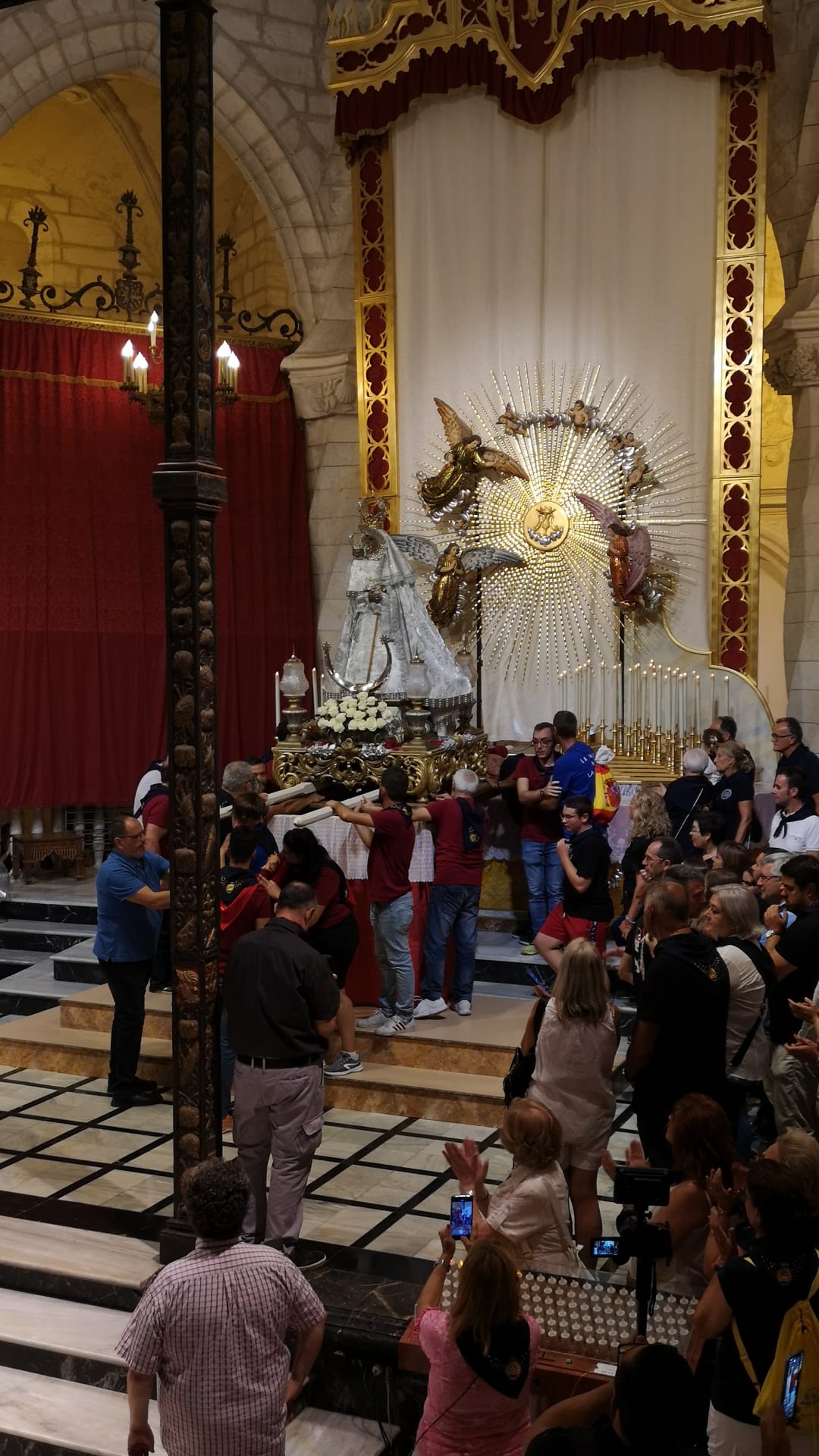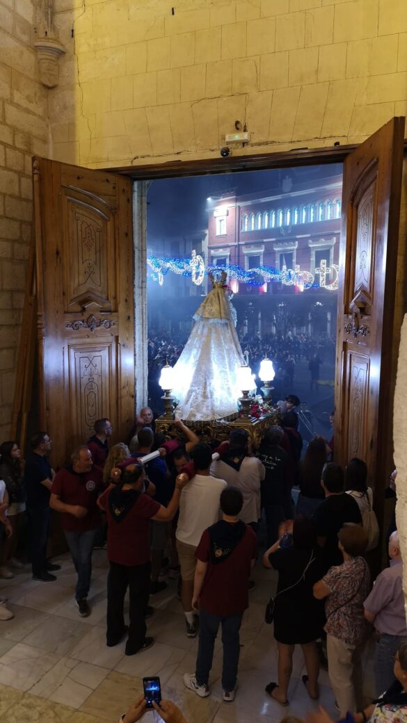 La Sagrada Imagen ha entrado en la Iglesia de los Padres Salesianos, donde se ha cantado el Himno de Bienvenida y donde ha permanecido hasta efectuar su salida precedida de los arcabuceros de las distintas comparsas, autoridades, cargos festeros, bandas de música y romeros, desde la Plaza María Auxiliadora, por Avda. Constitución, Joaquín María López, Luciano López Ferrer, Isabel La Católica, Trinidad, Trinitarias, Plaza de las Malvas, Iglesia del Asilo de Ancianos (donde se ha tenido un acto de acogida y oración), Congregación, Iglesia de las Monjas Trinitarias (donde se ha tenido otro acto de acogida y oración), Corredera, Capitán López Tarruella y Plaza de Santiago, donde la Patrona ha entrado a la Iglesia Arcedianal de Santiago Apóstol por la puerta principal (calle Marqués de Villores) y ha asomado por la puerta lateral del Tempo a la Plaza de Santiago al tiempo que se rodaran las banderas por parte de los alféreces de las comparsas, mientras se realizan salvas de arcabucería. Nuevamente introducida en el tempo, y tras el recorrido tradicional por el interior del mismo, la Banda Municipal de Música de Villena interpreta el Himno Nacional y se canta el Himno de Bienvenida al tiempo que la Sagrada Imagen será elevada a su Trono en el Altar Mayor desde donde presidirá todos los actos religiosos y festivos hasta el día 9 de Septiembre por la mañana.