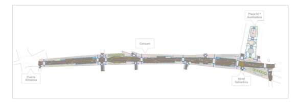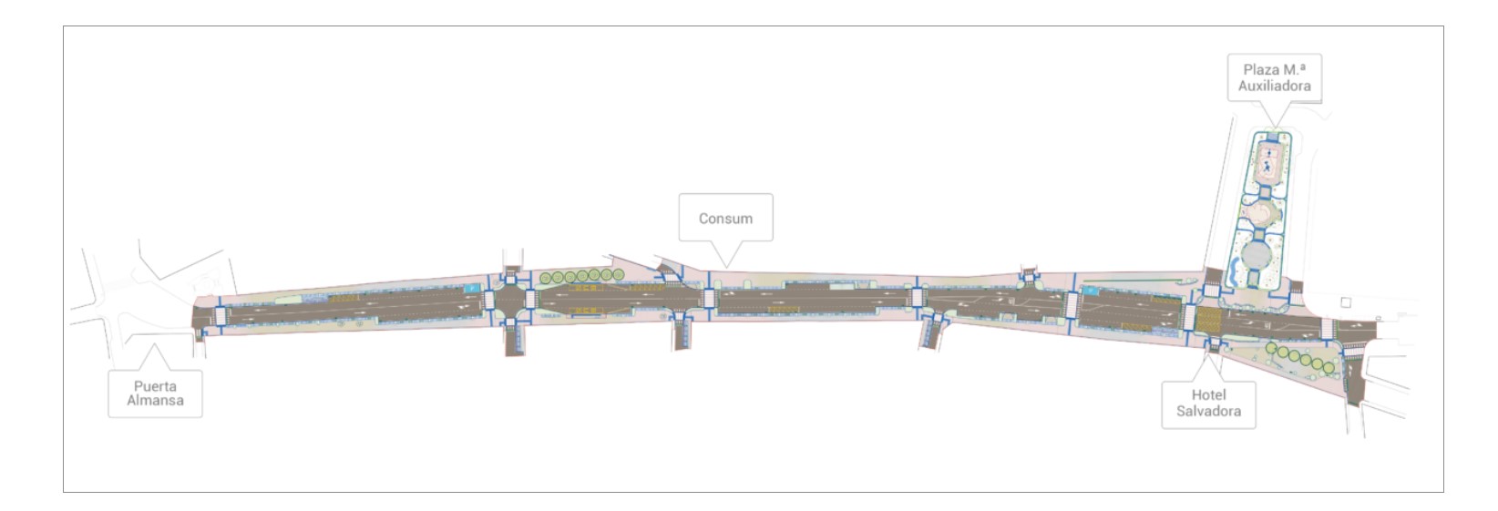 La primera actuación será la sustitución de la tubería principal de abastecimiento de agua potable en el tramo comprendido entre la puerta Almansa y el centro comercial La Pirámide. Esto permitirá cambiar la red estructural de abastecimiento de agua potable, evitando durante la realización de la obra cortes más severos en el suministro de agua potable. Esta actuación inicial tiene un plazo de ejecución de un mes, para continuar posteriormente entre el Banco Santander y el Colegio Salesiano.