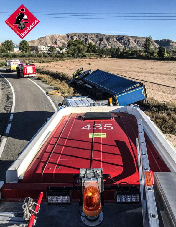 El accidente de tráfico fue de un camión de grandes dimensiones. El conductor quedó atrapado dentro de la cabina del vehículo y estaba consciente y sin lesiones, eso sí, el consorcio de Bomberos realiza una extracción segura del conductor evitando lesiones, y abriendo el vehículo para que pudiera salir al quedar el camión volcado lateralmente sobre un terraplén.
