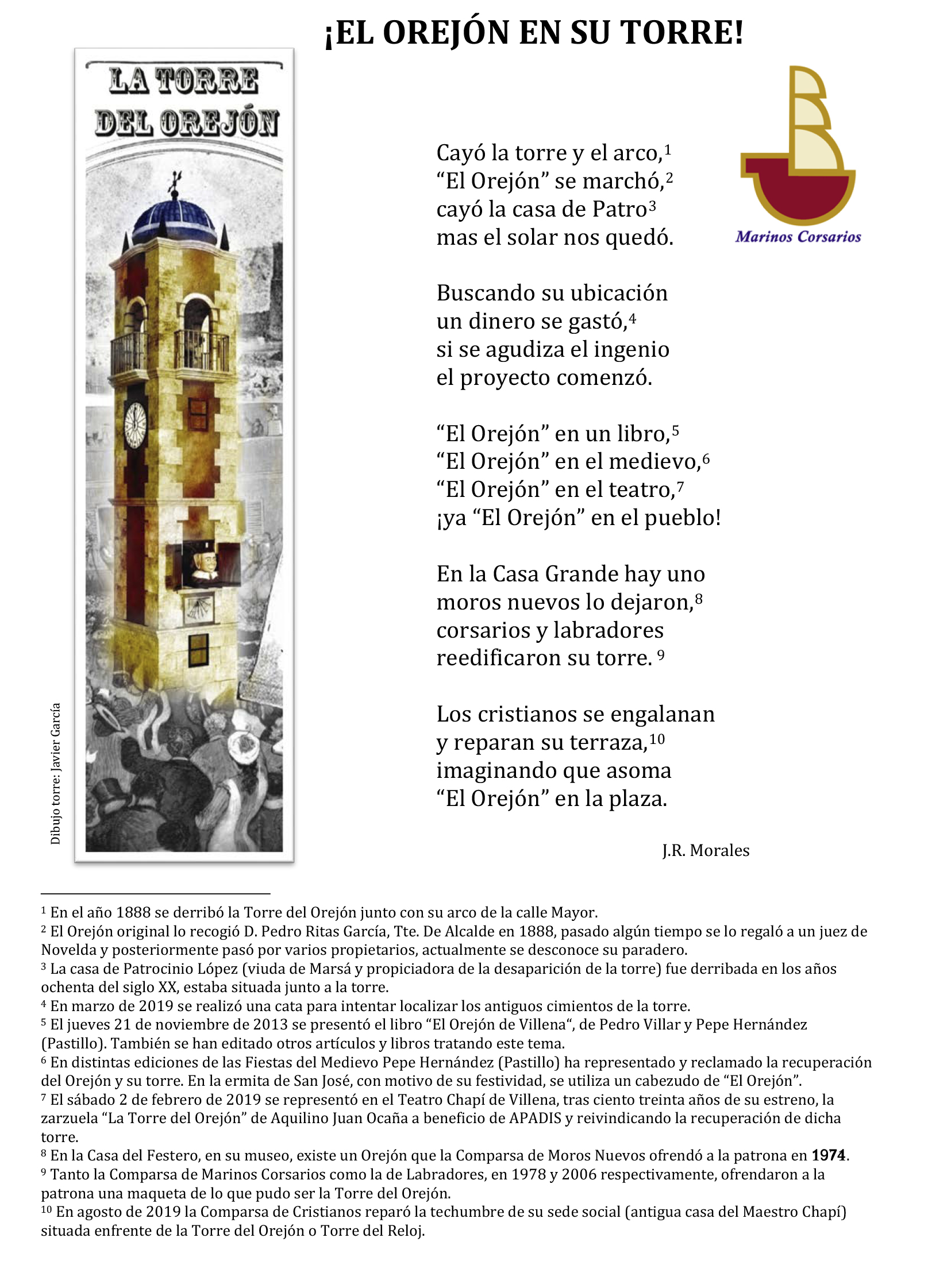 Todos estos testimonios nos corroboran que Villena y sus villeneros recuerdan su existencia cada cierto tiempo y reivindican, a su vez, el compromiso municipal de ofrecer a sus ciudadanos la hora, día tras día, con un reloj, con su autómata y su torre prometida.