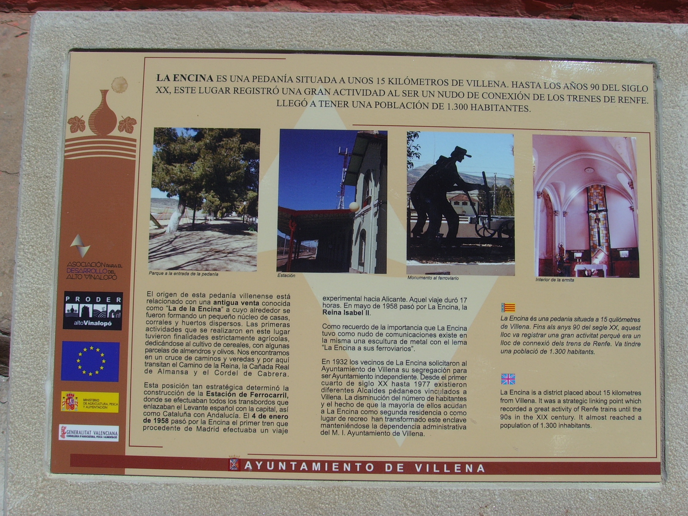 En los paneles, se puede leer que el cuatro de marzo de «1958», pasó por La Encina el primer tren que procedente de Madrid efectuaba un viaje experimental hacia Alicante. Aquel viaje, duró 17 horas. En mayo de «1958» pasó por La Encina la Reina Isabel II.