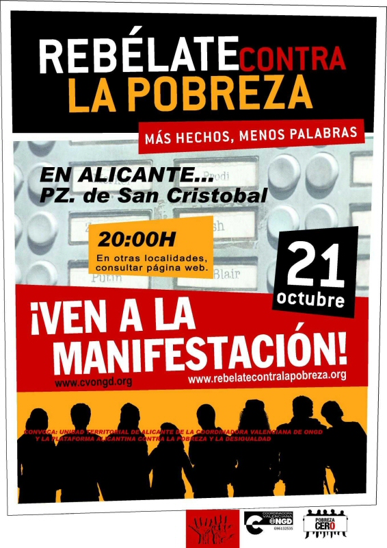 El pasado 17 de octubre se celebró a escala mundial el día contra la pobreza y con tal motivo está convocada en Alicante para el próximo sábado día 21 una concentración, contra la pobreza y por el cumplimiento de los Objetivos del Milenio.